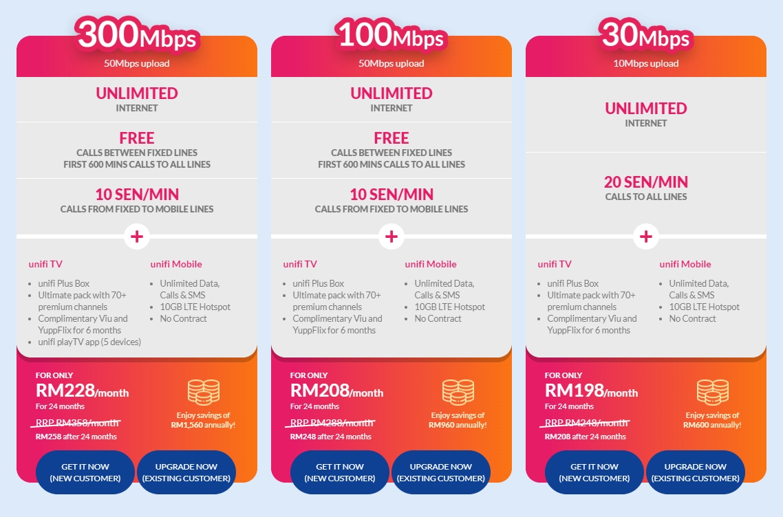 The add-on for Mesh WiFi, Unifi TV and Unifi Mobile is also available for the 300Mbps plan and below. Take note that the promo price is only valid for the first 24 months and you’ll have to pay RM10-RM40 extra each month after that.