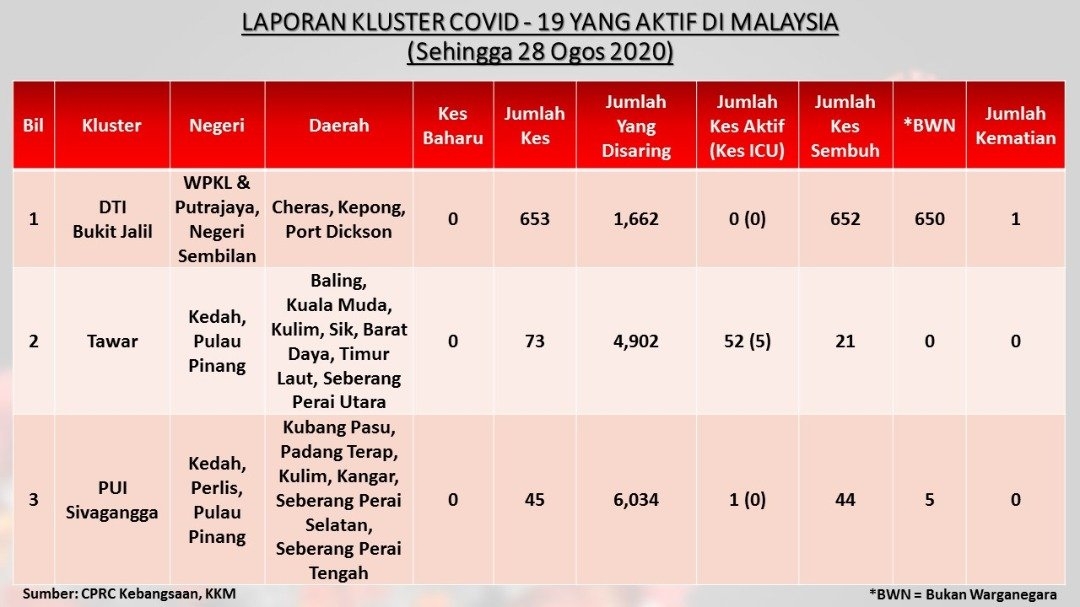 The Bukit Jalil detention centre still has the highest number of positive cases at 653, followed by Tawar Cluster at 73 and Sivagangga cluster at 45.