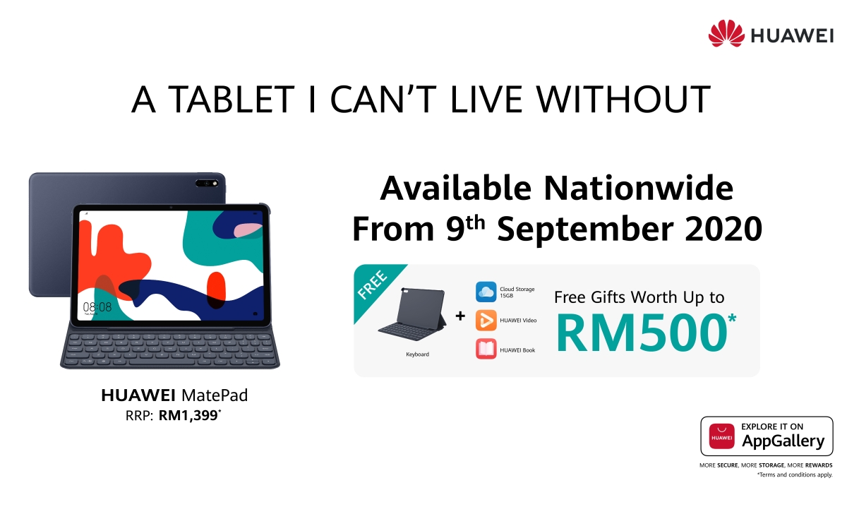 Huawei Malaysia is also bundling a free keyboard and freebies worth up to RM500. This includes Huawei Video (3 months), Huawei Book (until 31st December 2020), Huawei Member Centre Rewards and 15GB Huawei Cloud Storage (12 months) . The device will be available on the official Huawei Store. Interestingly, the MatePad is already listed on Lazada but it only comes with free flip cover.