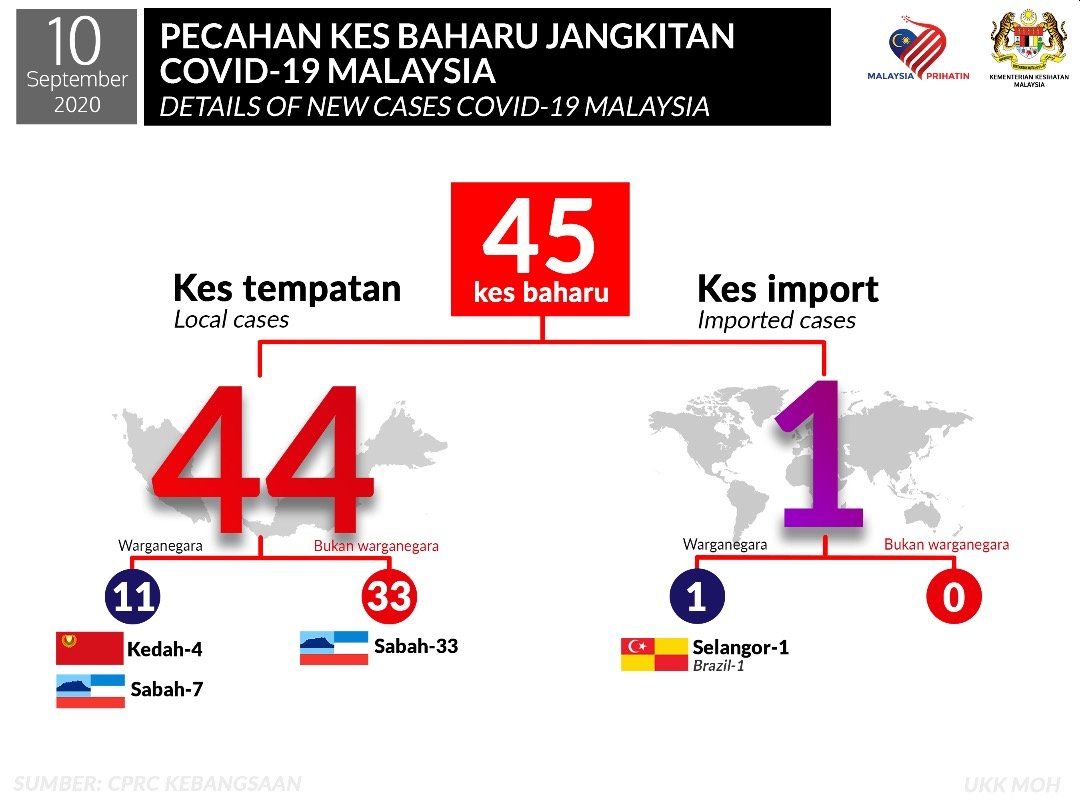 Out of the 45 cases today, there’s only 1 imported case involving a Malaysian returning from Brazil and the remaining 44 cases are transmitted locally. All 40 cases in Sabah are from the Benteng LD cluster which consists of 7 Malaysians and 33 foreigners.