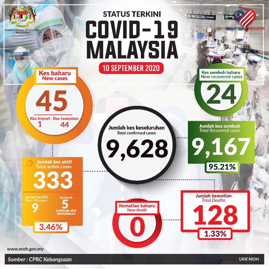 Malaysia records 45 new cases today which brings the total number of infections to 9,628. Fortunately, there are no new deaths recorded and the death toll currently remains at 128.