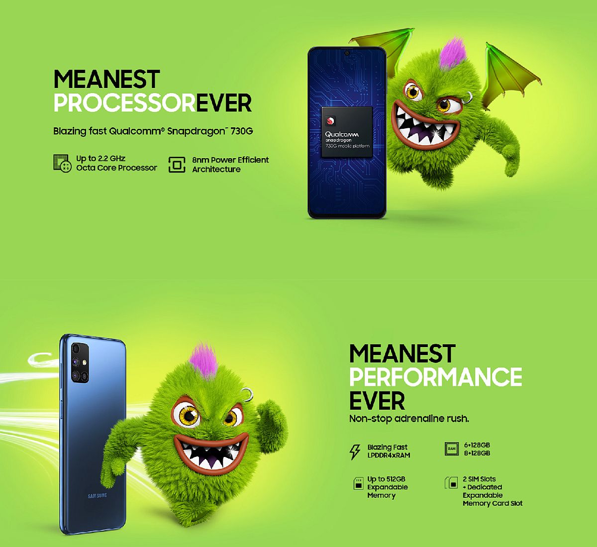 As revealed earlier on Samsung Germany’s website, the device looks like a typical Galaxy A series phone with a rectangular camera bump at the rear. Upfront, the M51 features a 6.7” Full HD+ Super AMOLED Plus display that boasts a 78960:1 contrast ratio. There’s a punch-hole on the top of the screen which houses a 32MP Sony IMX616 front camera.