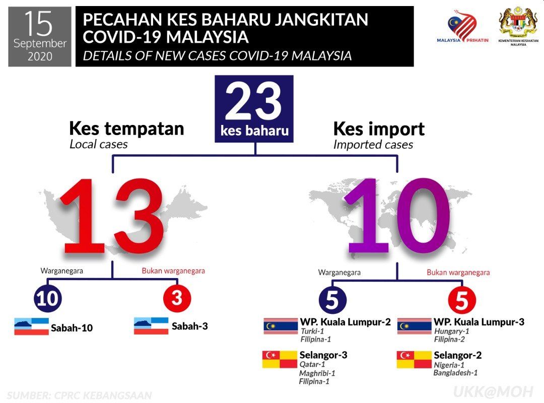 Out of the 23 new cases today, 10 are imported while 13 are transmitted locally. The imported cases consists of 4 individuals arriving from the Philippines, 1 from Bangladesh, 1 from Turkey, 1 from Hungary, 1 from Nigeria, 1 from Qatar and 1 from Morocco. Half of the imported cases are returning Malaysians.