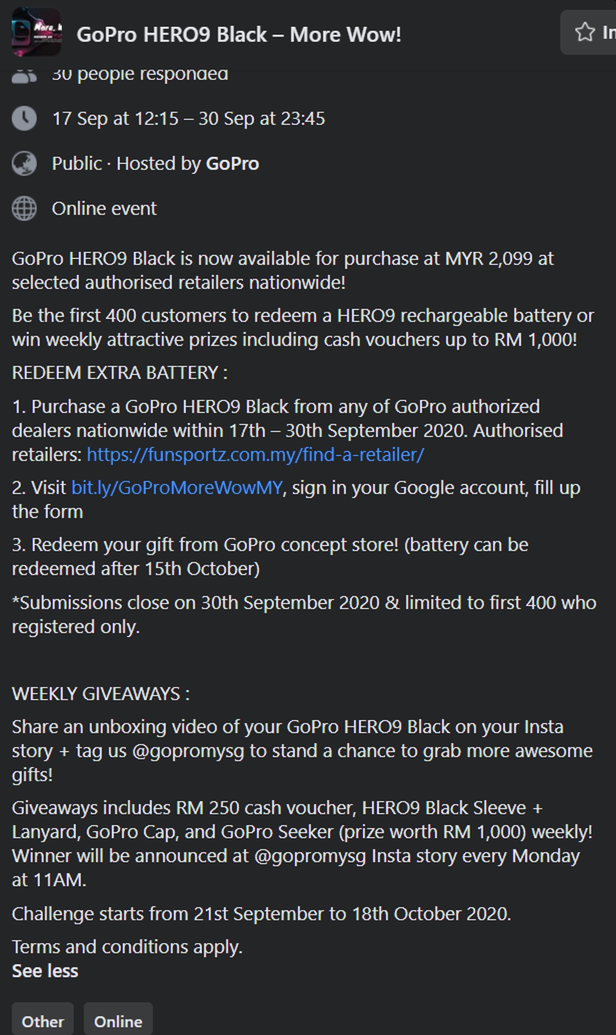 Additionally, the first 400 customers will be able to redeem a Hero 9 Black rechargeable battery (supposedly improved by 30 percent) for free, or have a chance at weekly prizes worth up to RM1,000.