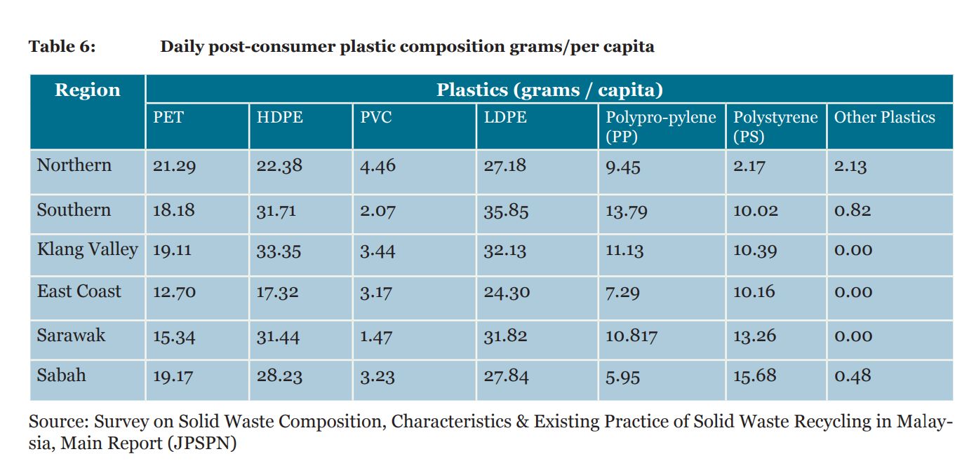 The report’s 2016 post-consumer plastic waste per capita estimation was based on population data collected by the Department of Statistics and a survey on Solid Waste Composition, Characteristics & Existing Practices of Solid Waste in Malaysia commissioned by The Department of National Solid Waste Management (JPSPN) in 2013.