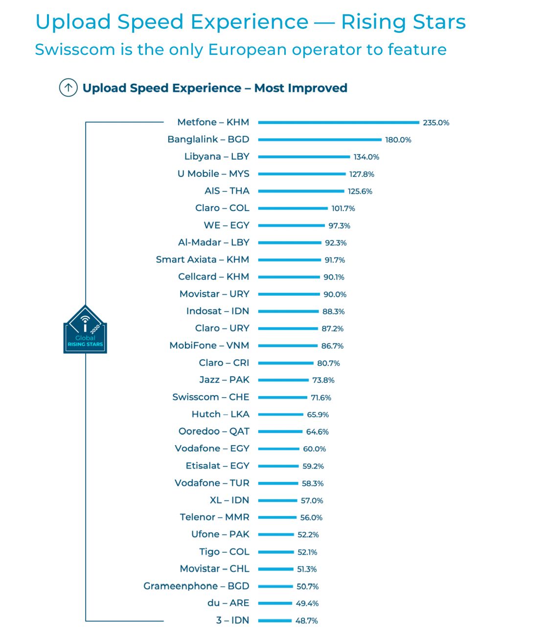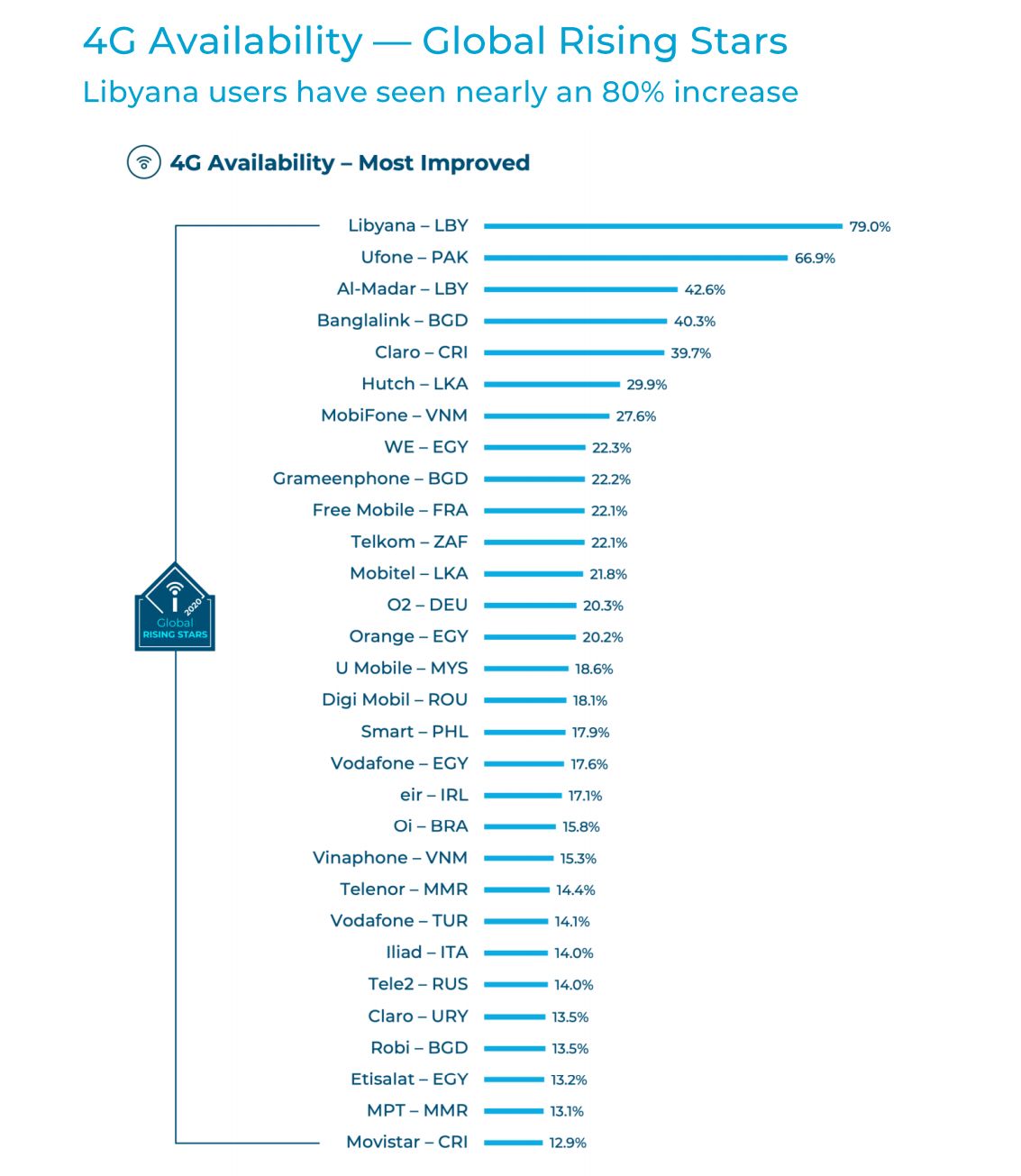 In terms of speeds, Telus of Canada is the winner with average downloads at 75.8Mbps, which is 3.4 times the global average. Swisscom of Switzerland takes the top spot for uploads with an average speed of 18.2Mbps. When it comes to 4G availability, Japan’s au records a near perfect score of 99%, and it is followed closely by Rakuten and NTT Docomo in Japan with 98.6% availability. Both runner-ups were given the Global Leaders award.
