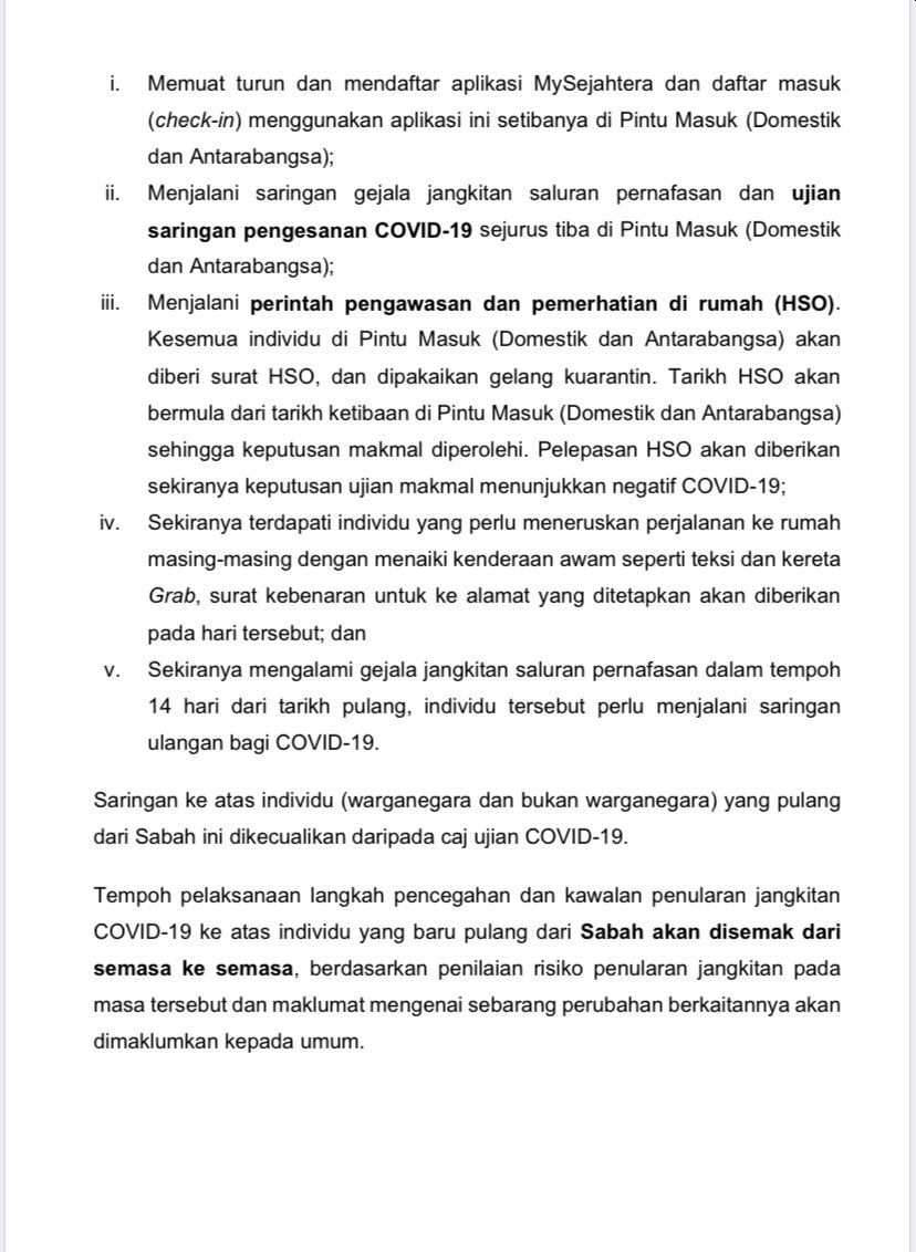 The Ministry of Health is waiving the COVID-19 test charges for all individuals including Malaysians and foreigners that arrive from Sabah. The duration and measures for this new restriction will be monitored from time to time and the Ministry will make necessary announcements to the public depending on the situation.