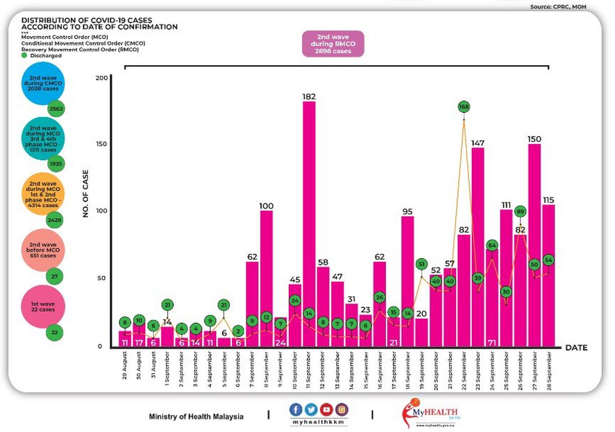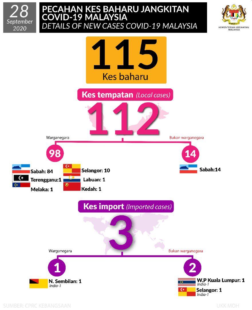 Out of 115 cases reported today, 3 are imported while 112 are transmitted locally. The imported cases consists of 1 Malaysian and 2 foreigners arriving from India.
