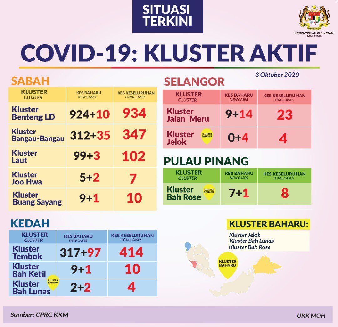 The Ministry of Health has identified 3 new clusters which include Jelok in Selangor, Bah Lunas in Kedah and Bah Rose in Pulau Pinang. The Bangau-bangau cluster in Sabah has recorded 35 new cases while Benteng cluster has 10 new cases.