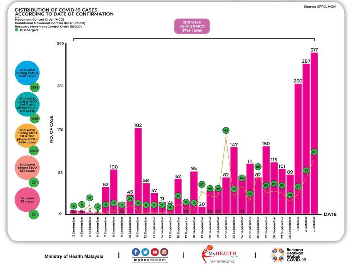All 317 COVID-19 cases today are transmitted locally which consists of 303 Malaysians and 14 foreigners. The Ministry added that 37 cases reported today involved individuals that have returned from Sabah. Since 20th September, there are a total of 176 cases which has a recent travel history to Sabah.