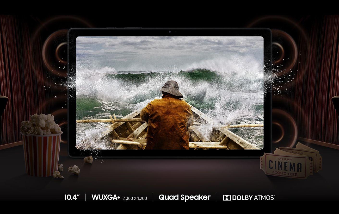 The Galaxy Tab A7 features a 10.4″ TFT display that pushes a 2000×1200 pixels resolution. For a more immersive audio experience, the tablet gets a quad-speaker setup enhanced by Dolby Atmos.