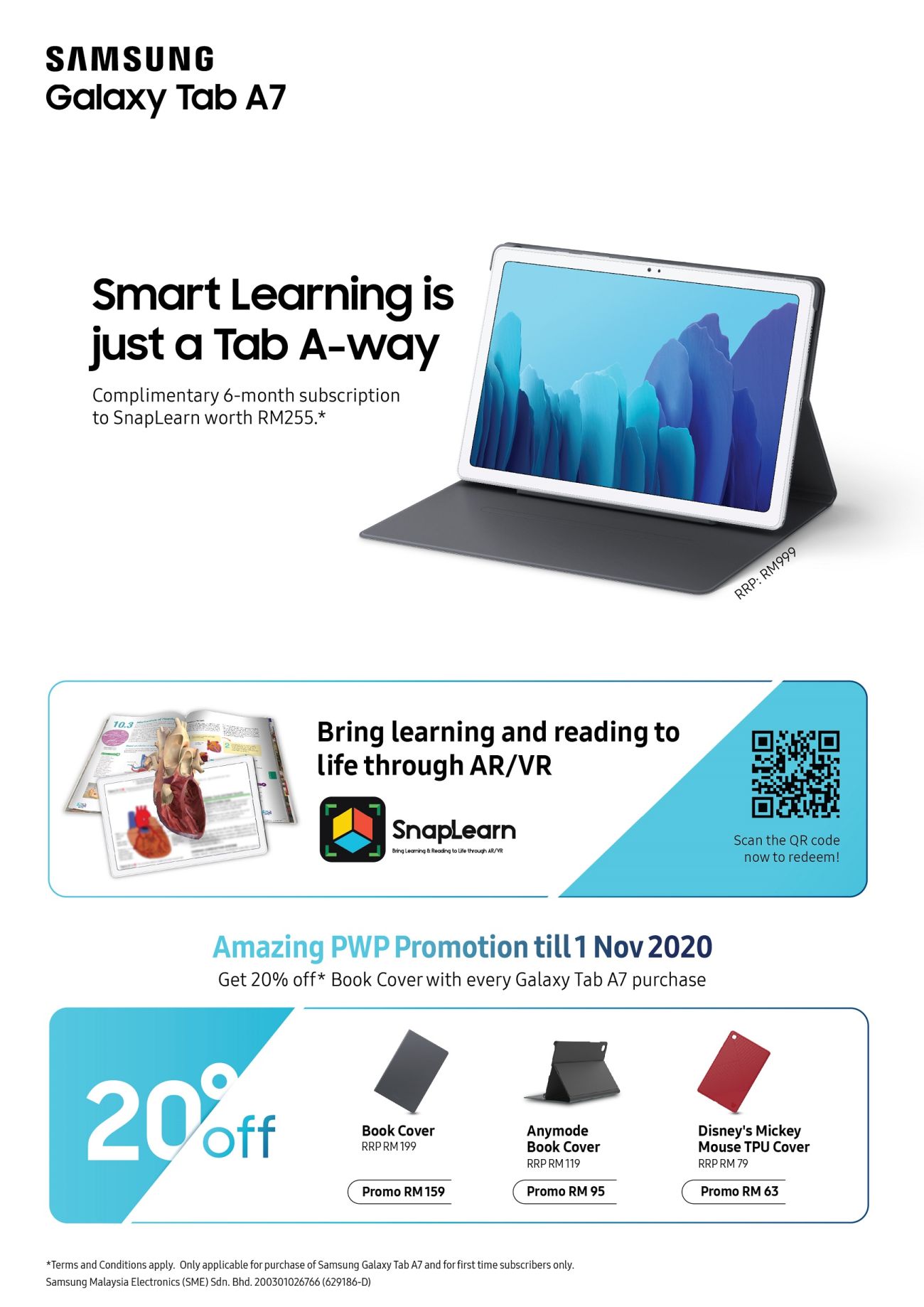 As an introductory promotion, the Tab A7 is offered with Purchase-with-Purchase (PWP) promo where you can get 20% off for selected accessories. The Book Cover can be yours for RM159 (RRP: RM199), while the Anymode Book cover is going for RM95 (RRP: RM119). The Disney’s Mickey Mouse TPU cover is also offered on discount for RM63 (RRP: RM79).