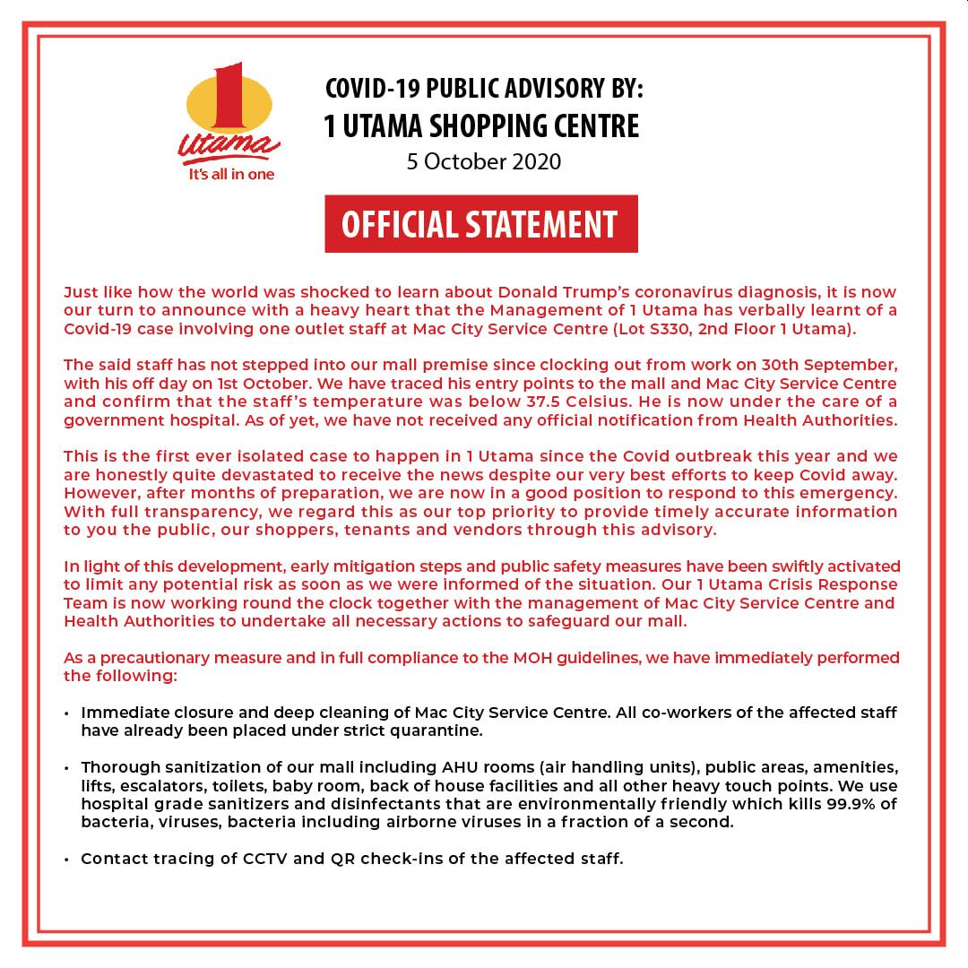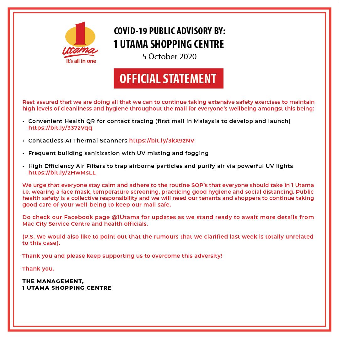 “This is the first ever isolated case to happen in 1 Utama since the Covid outbreak this year and we are honestly quite devastated to receive the news despite our very best efforts to keep Covid away. However, after months of preparation, we are now in a good position to respond to this emergency. With full transparency, we regard this as our top priority to provide timely accurate information to you the public, our shoppers, tenants and vendors through this advisory.”