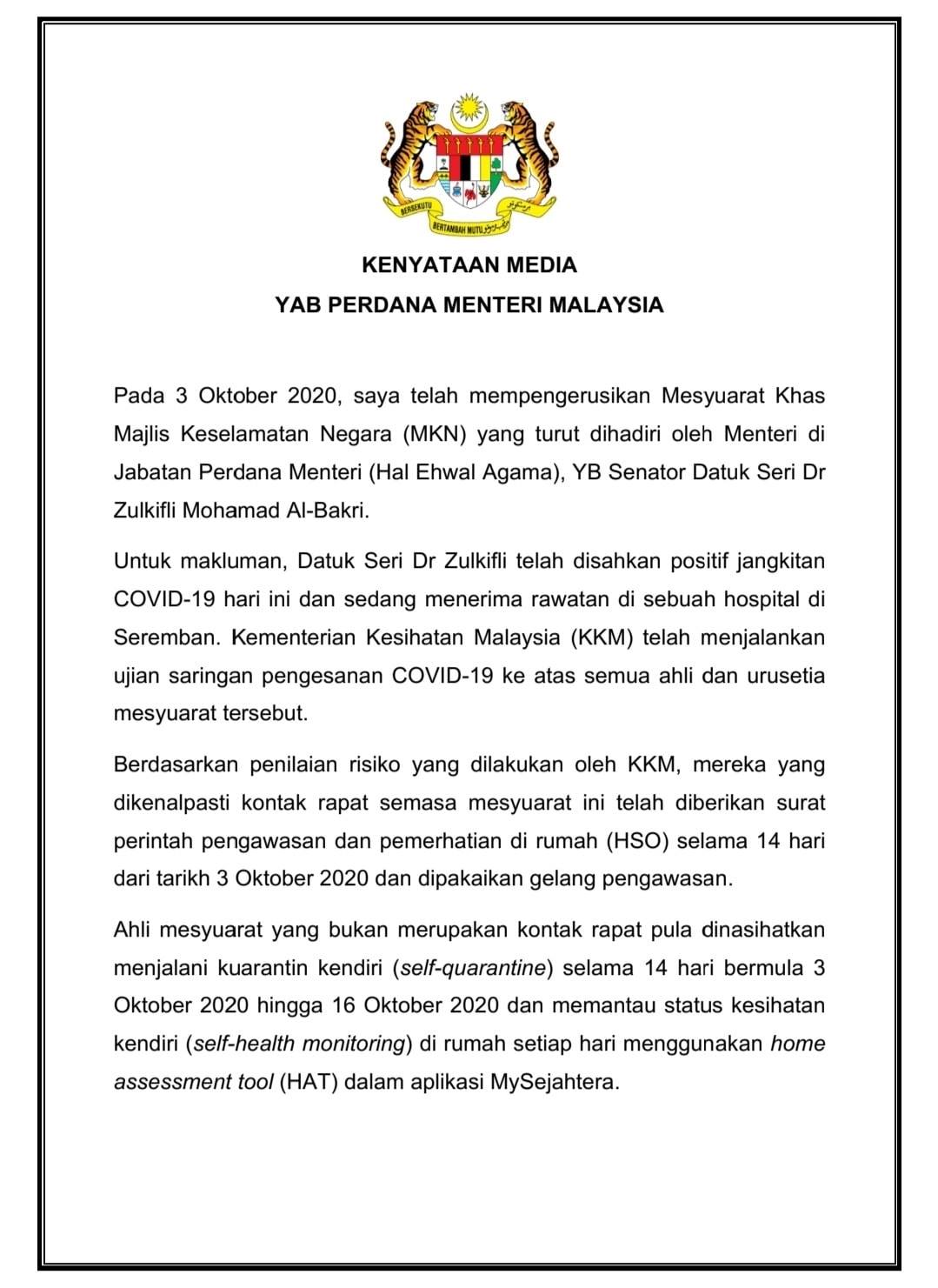 Malaysia Prime Minister Muhyiddin Yassin has confirmed that the Religious Affairs Minister Datuk Seri Dr Zulkifli Mohamad had attended the special National Security Council meeting which he chaired last Saturday. As revealed this afternoon, Dr Zulkifli was tested positive and is currently receiving treatment at a hospital in Seremban.