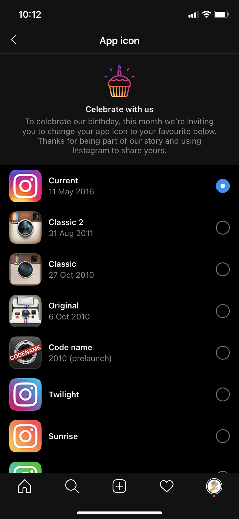 The choices for the Instagram home screens include old-school classic icons from 2010, a pre-launch icon, and a few different coloured versions of the new icon. However, Instagram’s message reads “this month we’re inviting you to change your app icon to your favourite”—meaning that whatever you choose as your icon might not stick after October.