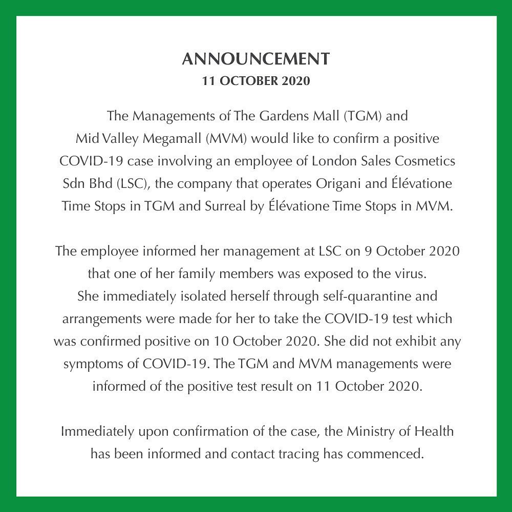 This comes after another shopping mall, Bangsar Shopping Centre, had also announced earlier today that one of its retail staff contracted COVID-19 and that disinfection procedures were underway.