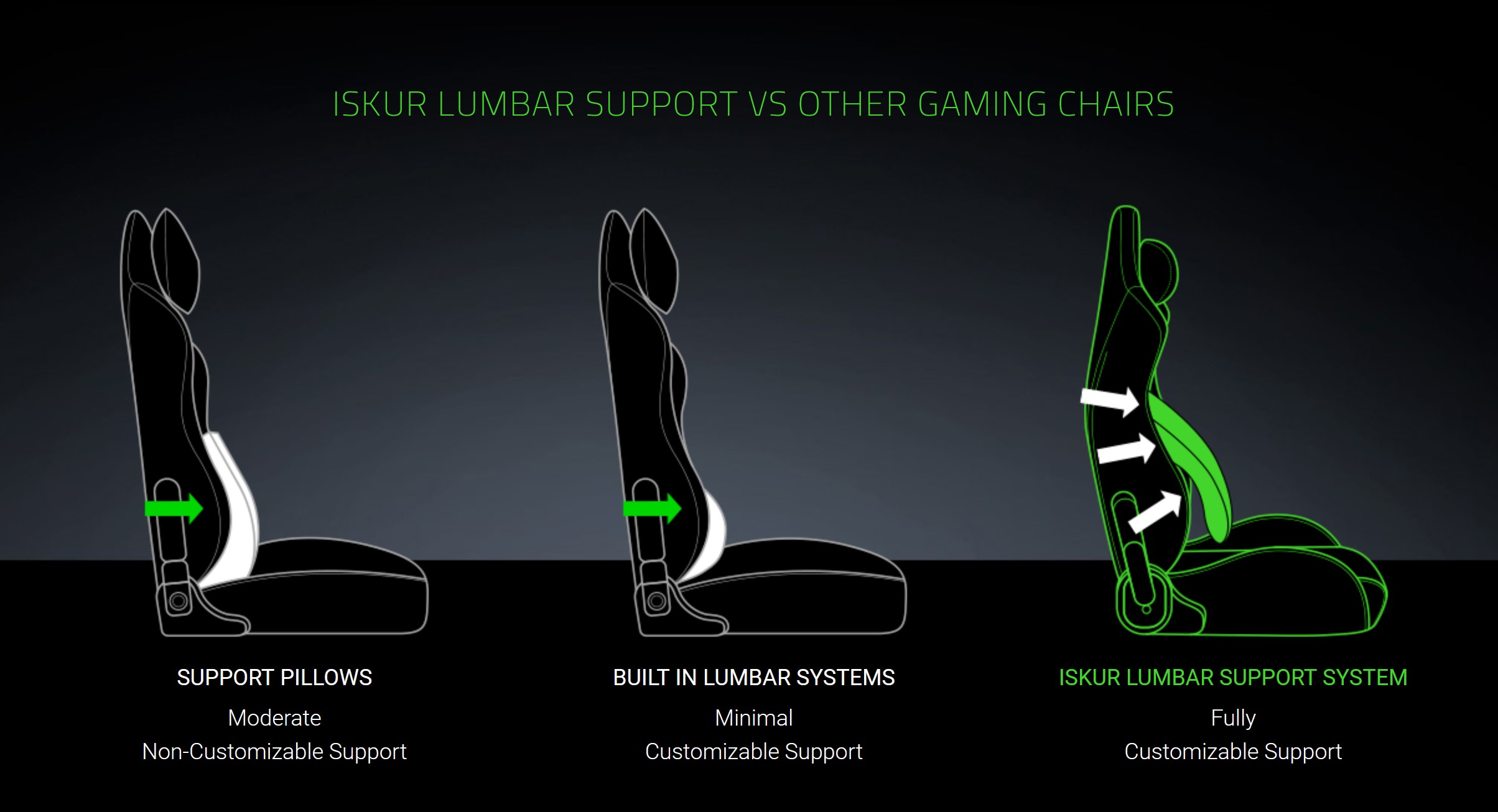 Razer claims the Iskur’s ergonomic lumbar support system provides total lower back support. You get a built-in fully adjustable lumbar curve that juts out and looks like a snake’s belly, closely aligns with the full curvature of the spine to achieve a neutral spin position for a healthy posture.
