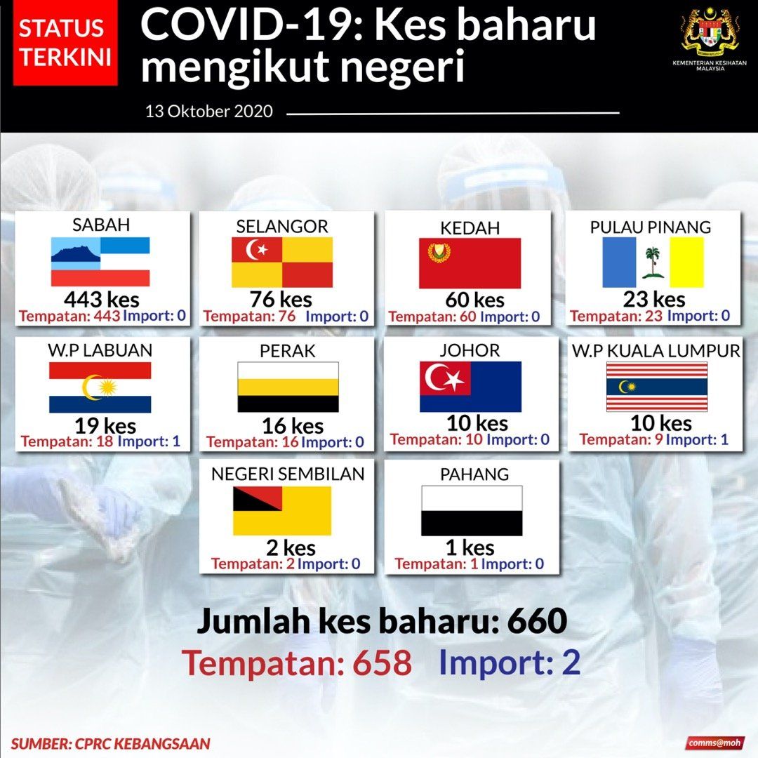 Out of the 660 cases today, 2 are imported while 658 are transmitted locally. Sabah has the most number of cases with 443, followed by Selangor with 76 cases and Kedah with 60 cases.