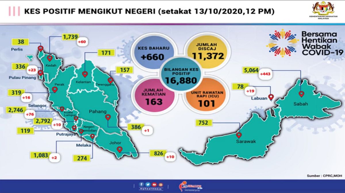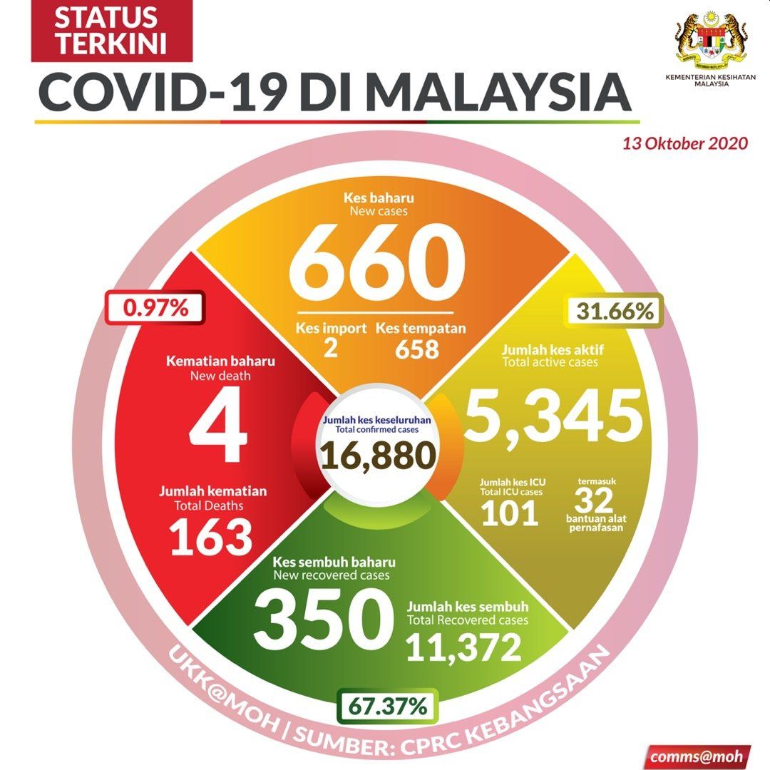 Malaysia has reported 660 new COVID-19 cases today which brings the total number of infections to 16,880. There are 4 new deaths today in Sabah and the overall death toll is now 163.