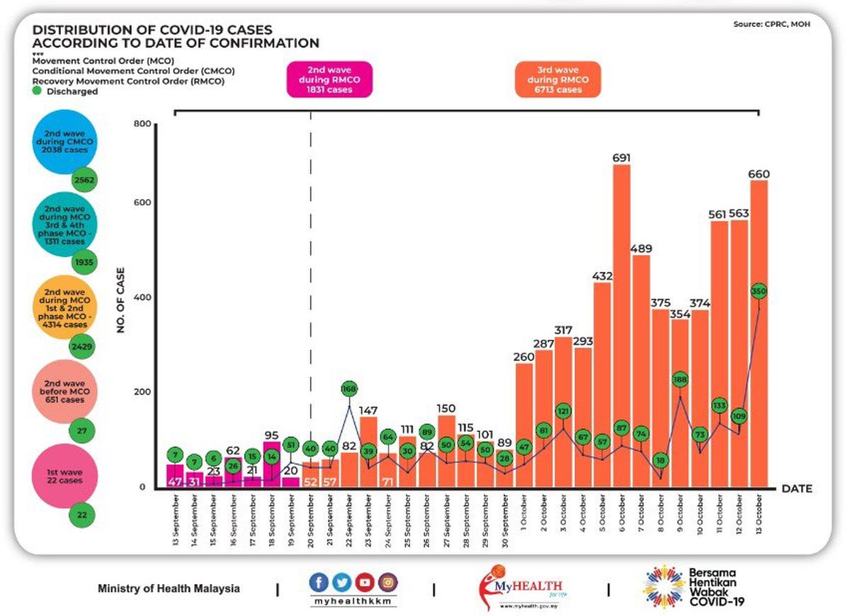 At 660 cases, today marks the second highest daily count of new COVID-19 cases in Malaysia. Malaysia has been recording more than 250 new cases daily since 1st October 2020. To curb the spread of the disease, CMCO has been declared for Selangor, Kuala Lumpur and Putrajaya starting tomorrow while Sabah’s statewide CMCO has come into force starting today.