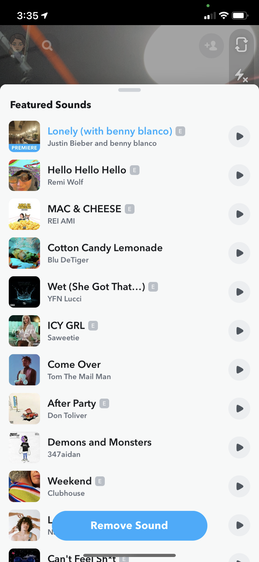 From what I’ve noticed, Snapchat only lets me pick ‘Featured Sounds’—and there are only 20 sounds to choose from. However, they’re all official tracks released by recording artists and/or companies.