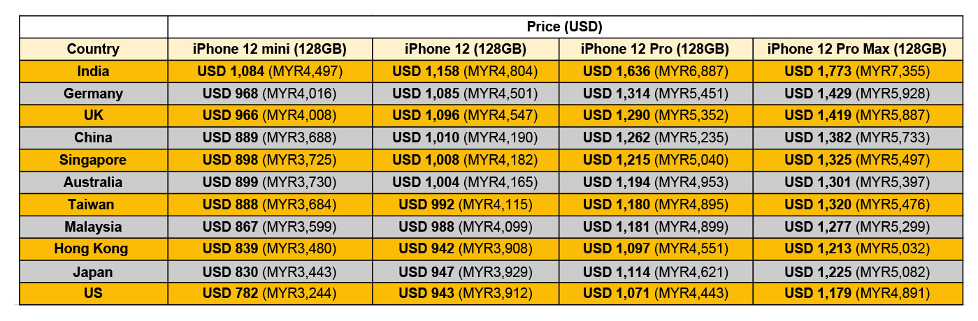 Conversely, customers in India pay the highest price for Apple’s smartphone with the base iPhone 12 costing a whopping USD 1,158 (MYR4,804). That is a premium of USD215 (MYR892) compared to the US. Meanwhile, the iPhone 12 Pro costs USD 1,636 (MYR6,887) in India, which is an extra USD565 (MYR2,345) more than what American customers pay.