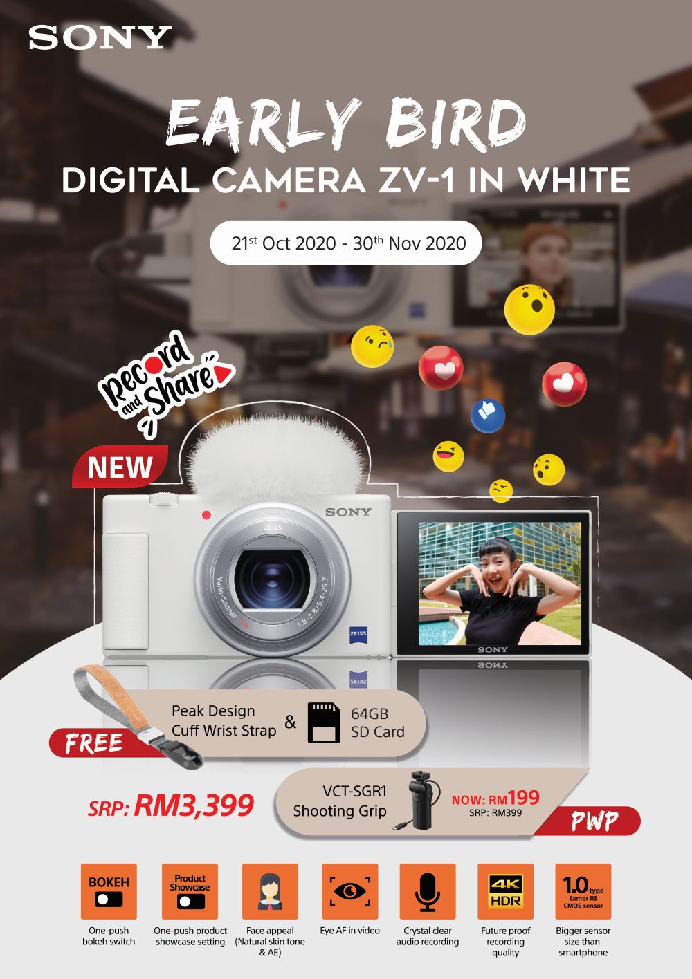 The Sony ZV-1 in white is now available in Malaysia at RM3,399. From now until 30 November, every purchase of a brand new ZV-1 White buyers to get a Peak Design wrist strap and a 64GB SD card for free.