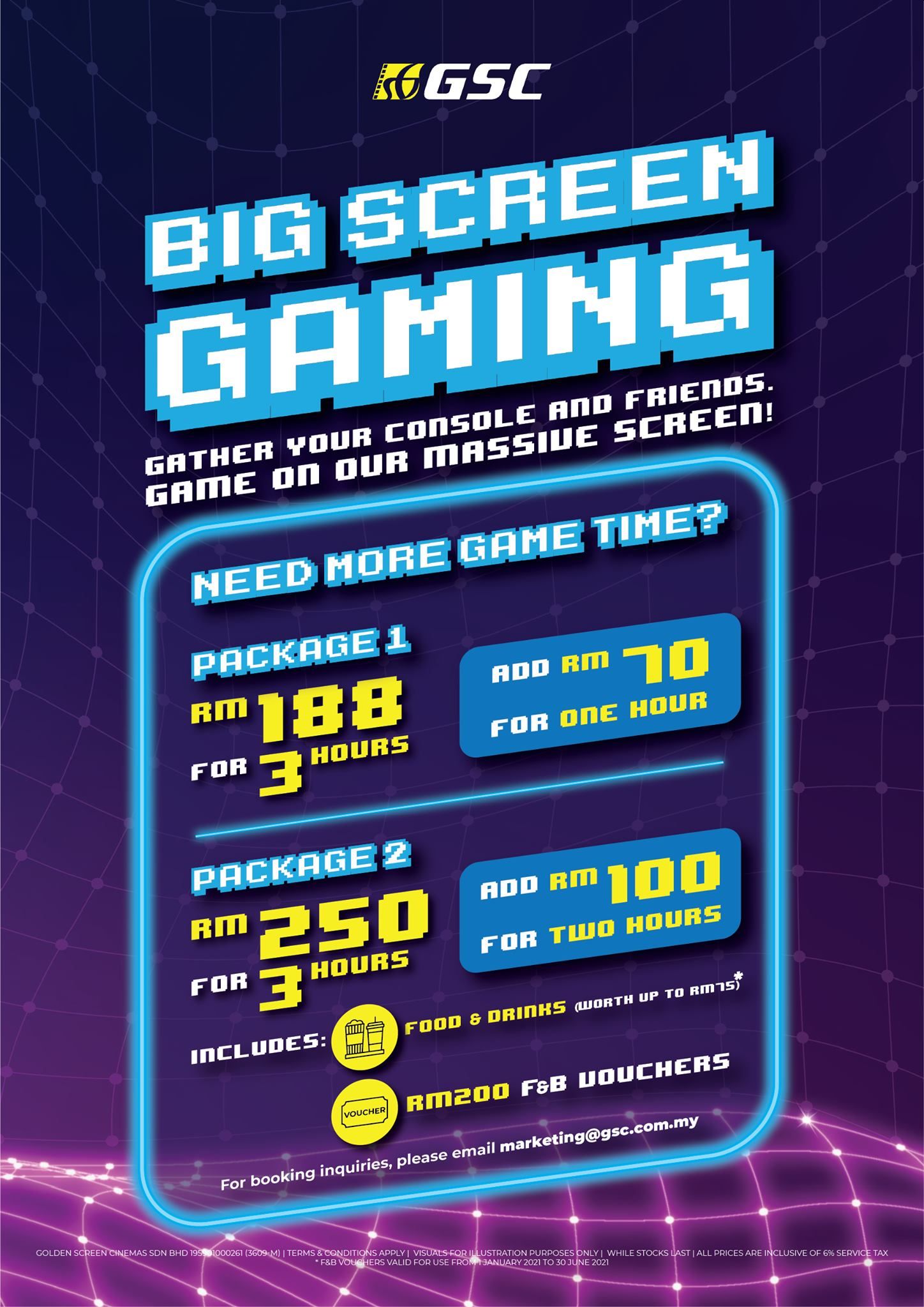Want to play your favourite console games on the big screen? Golden Screen Cinemas (GSC) now lets you book the entire cinema hall for gaming from as low as RM188 for a 3 hour session.