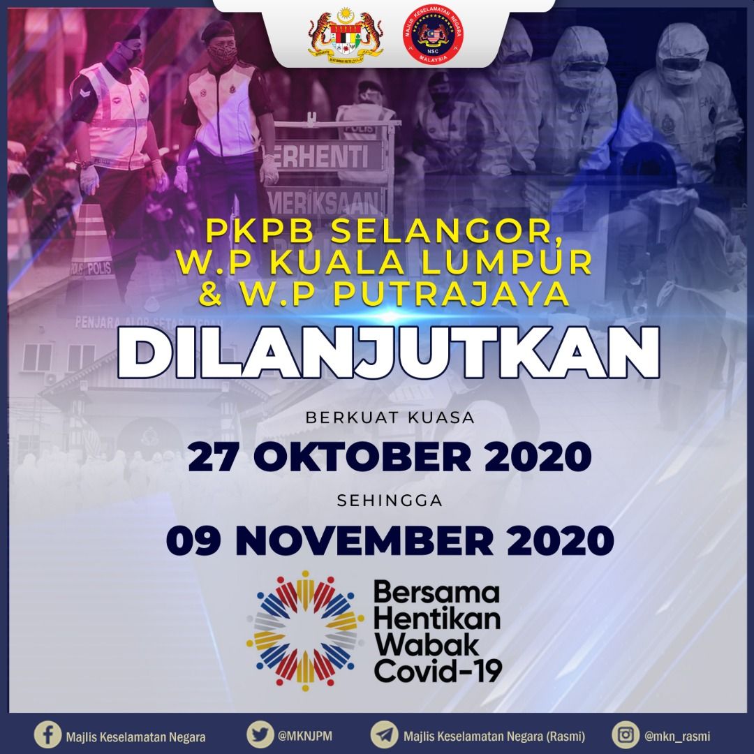 PKPB DI SELANGOR, KUALA LUMPUR DAN PUTRAJAYA DILANJUTKAN BERMULA 27 OKTOBER SEHINGGA 9 NOVEMBER 2020@IsmailSabri60 @KKMPutrajaya @MINDEFMalaysia pic.twitter.com/CzZZ0zUQvH