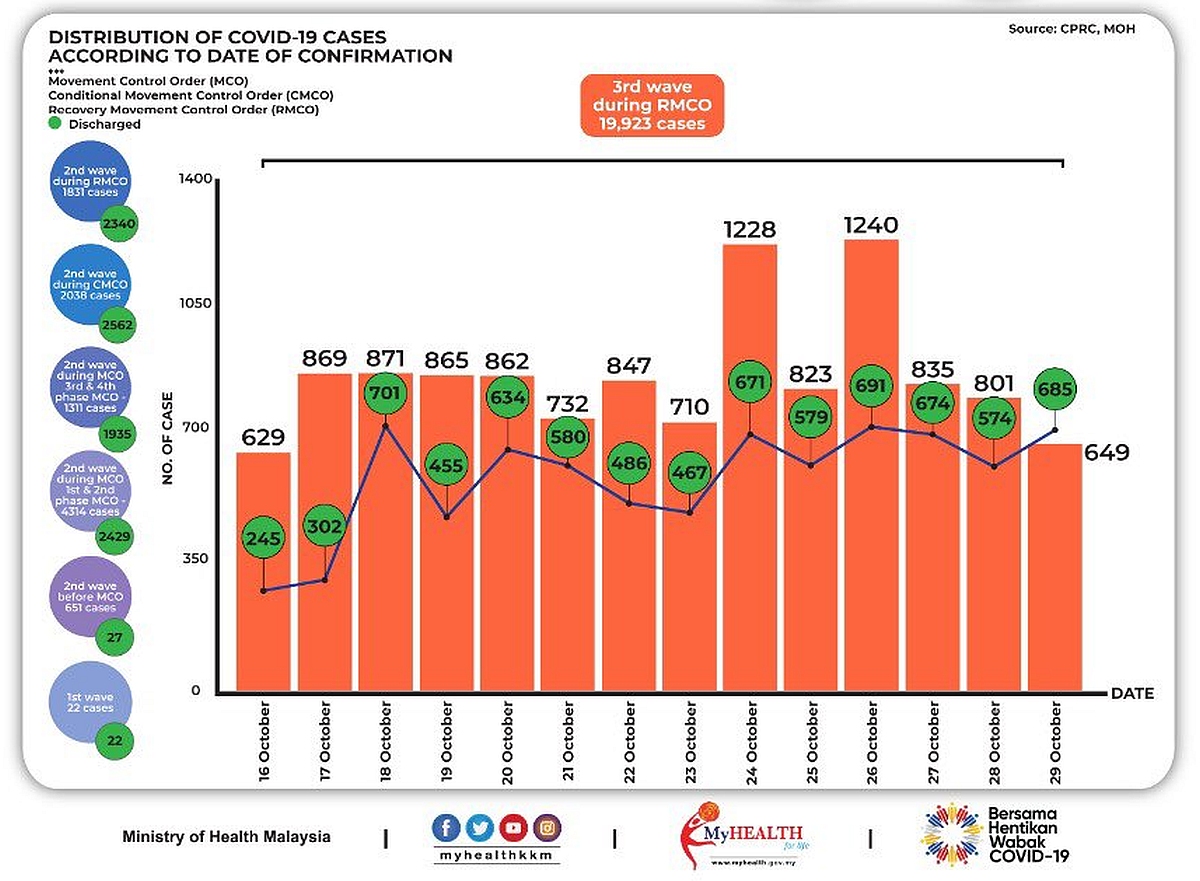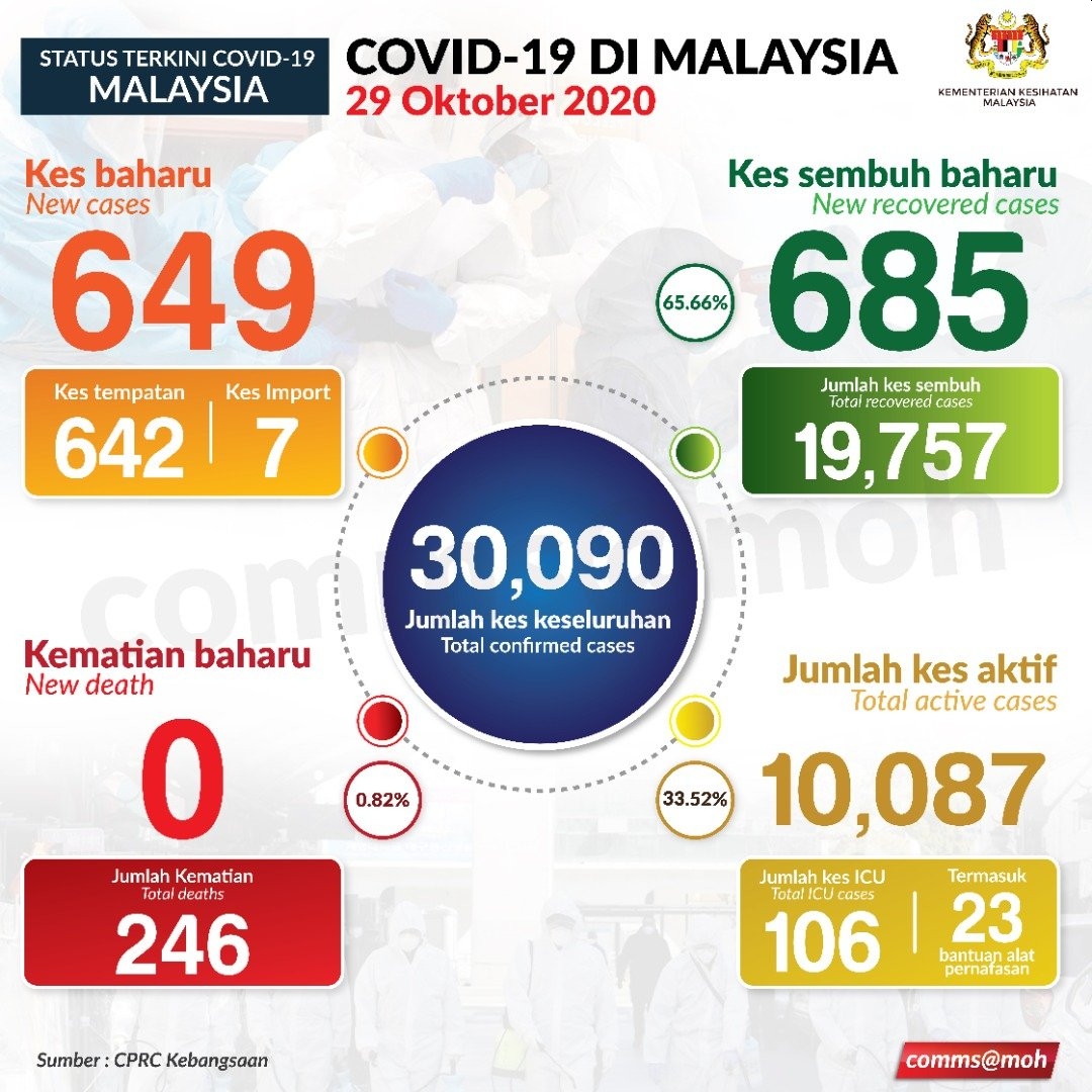 Malaysia has recorded 649 new COVID-19 cases today which brings the total number of infections to 30,090. Today marks the lowest new daily cases since 16th of October. For the first time since 7th October, there no new deaths reported today. The death toll remains at 246.