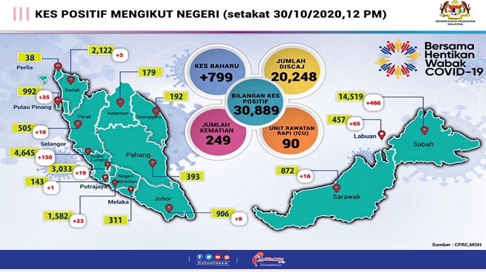 Malaysia has recorded 799 new COVID-19 cases today which brings the total number of infections to 30,889. There are 3 new deaths reported and the death toll is now 249.