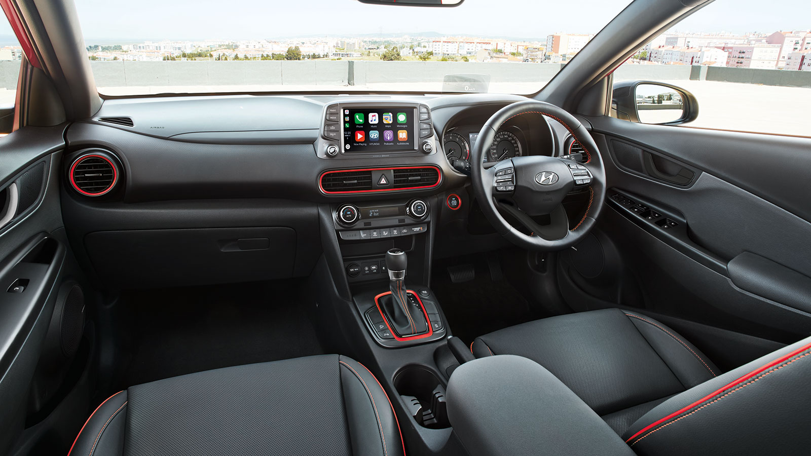 Hyundai states that the Kona has an inviting interior that features contrasting elements all around the cabin. This includes stitching on the steering wheels, seats and coloured seatbelts.