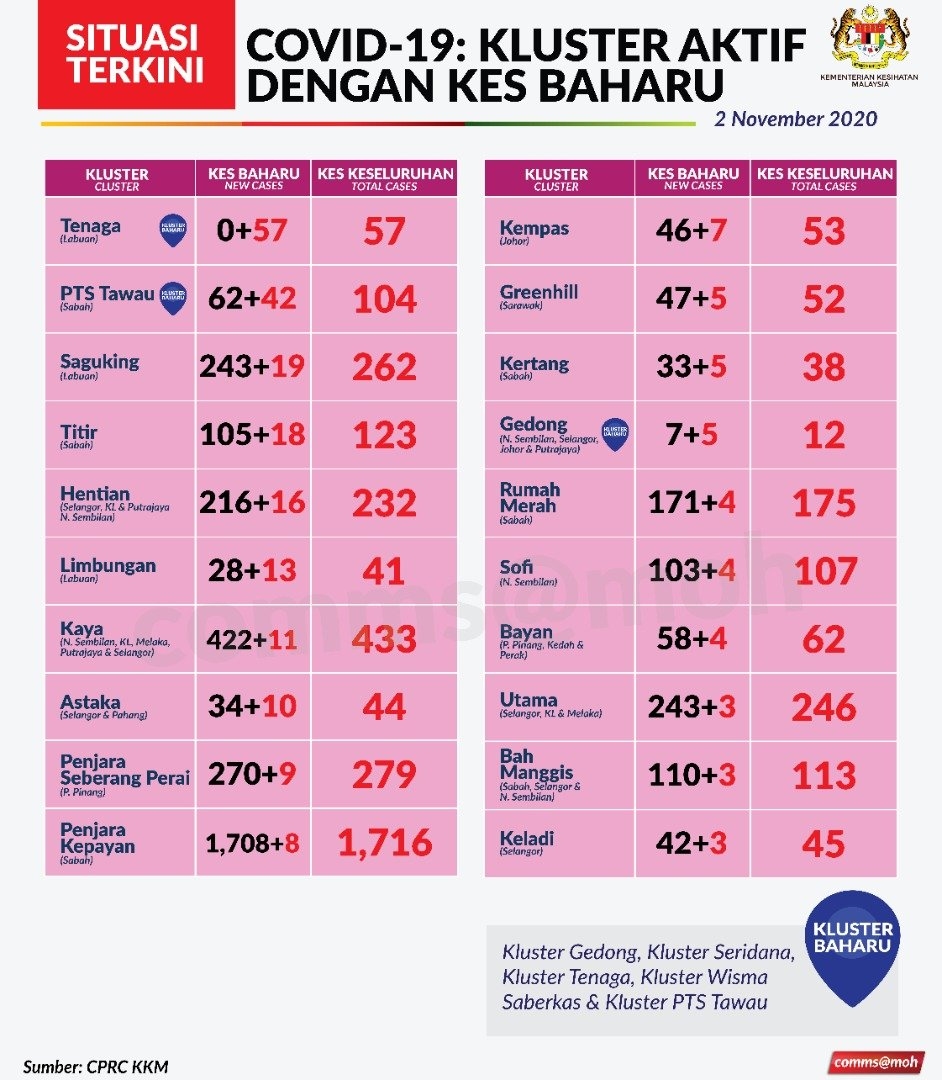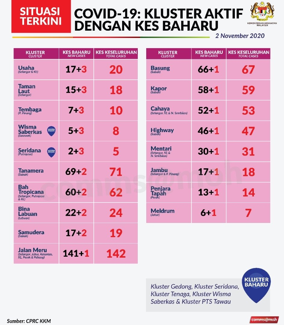 The Ministry of Health has identified 5 new clusters today. This include Wisma Saberkas cluster in Kuching, Seridana cluster in Putrajaya, Pusat Tahan Sementara (PTS) cluster in Tawau, Tenaga cluster in Labuan and Gedong cluster which covers the Negeri Sembilan, Selangor, Johor and Putrajaya.