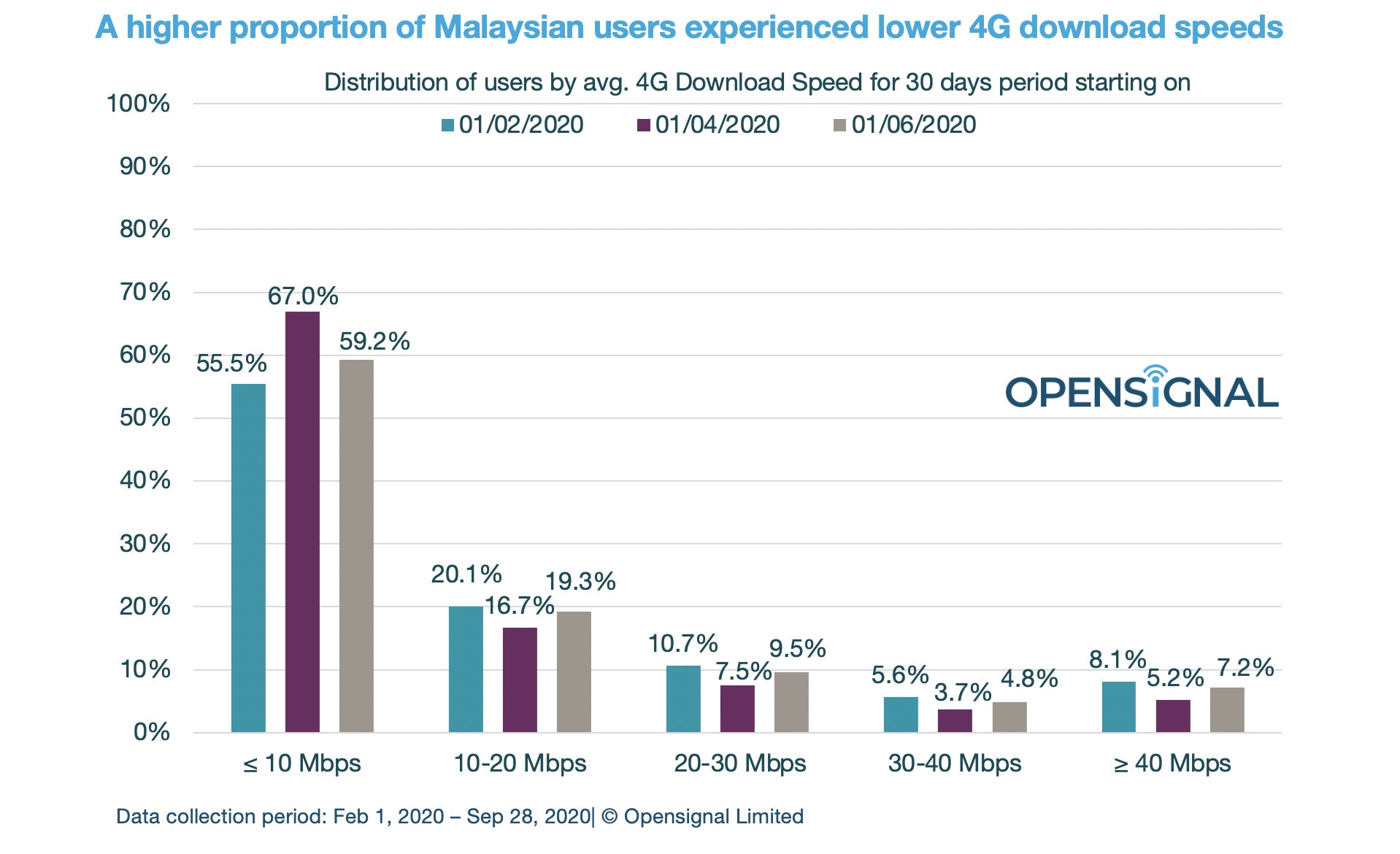 Opensignal also has a chart that categorises Malaysian 4G users by their average download speeds. Looking at the distribution chart above, users experiencing less than 10Mbps have jumped from 55.5% to 67% during the MCO. However, the situation has improved slightly in June.