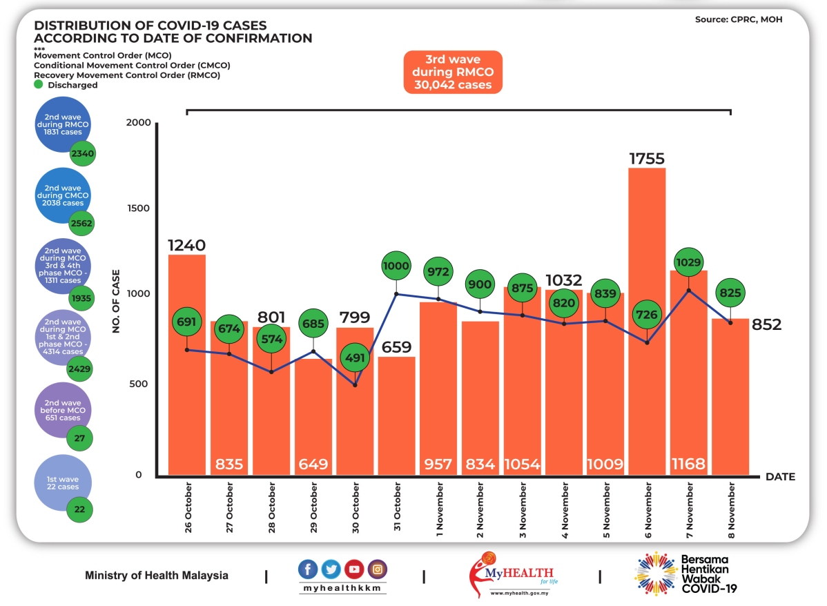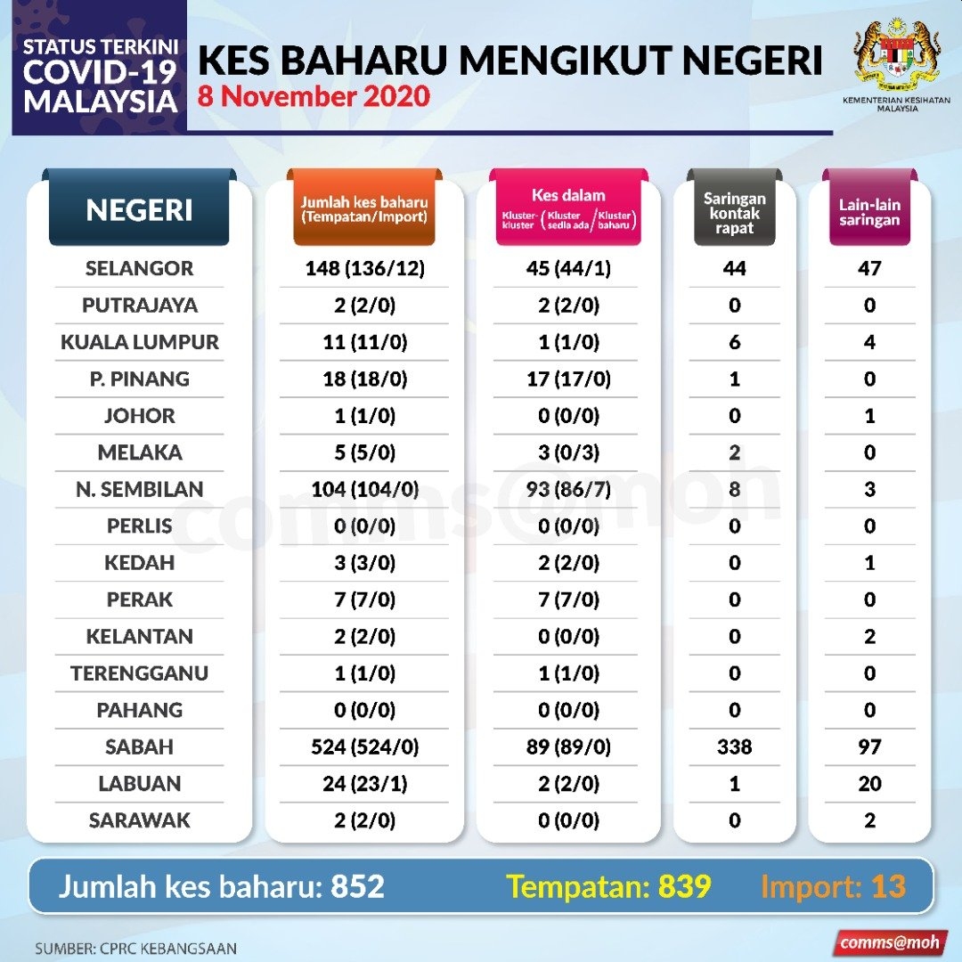 Out of the 852 new cases today, 13 are imported while 839 are transmitted locally. In terms of local cases, Sabah records the most with 524 cases, followed by Selangor with 136 cases (excluding 12 import cases), Negeri Sembilan with 104 cases and Labuan with 23 cases (excluding 1 import case). There are no new cases in Pahang and Perlis.