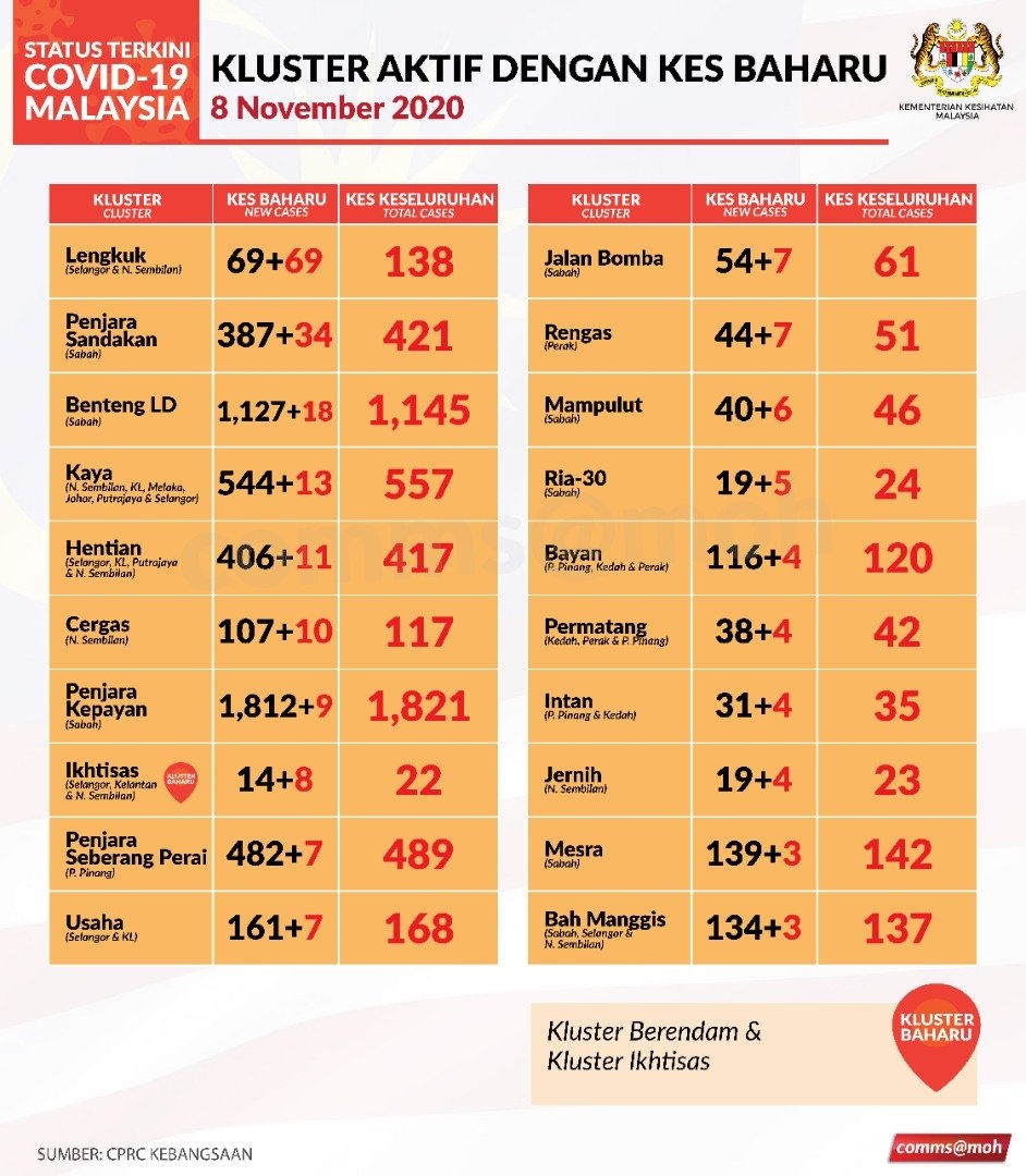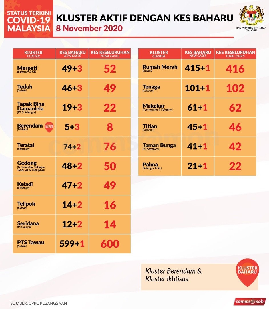 The Ministry has also identified 2 new clusters today. This include Ikhtisas cluster which covers Selangor, Kelanyan and Negeri Sembilan, and Berendam cluster in Melaka.