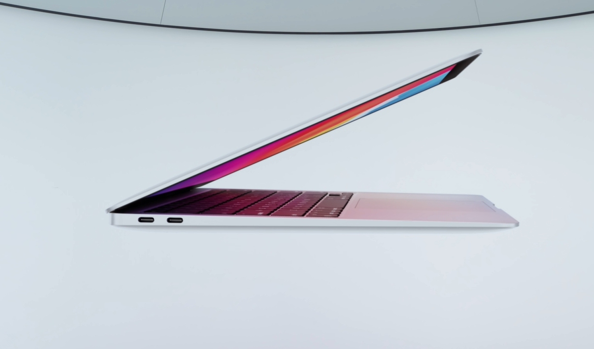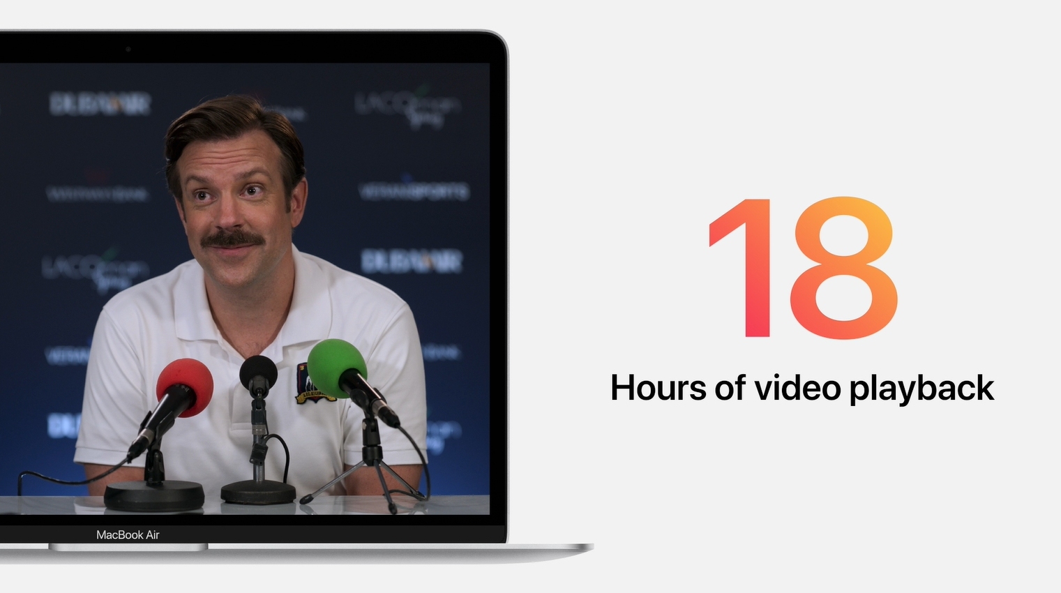 While it still retains a 720p HD web cam, the new MacBook Air takes advantage of its Neural engine performance to reduce noise, improve dynamic range and white balance for your video conferencing. Also retained is a pair of wide stereo speakers and a 3-mic array with directional beamforming.