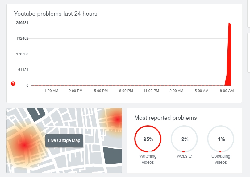 According to downdetector, there’s a surge of new YouTube complaints since 8am this morning. Most complaints are coming from the US and Europe based on the live outage map.