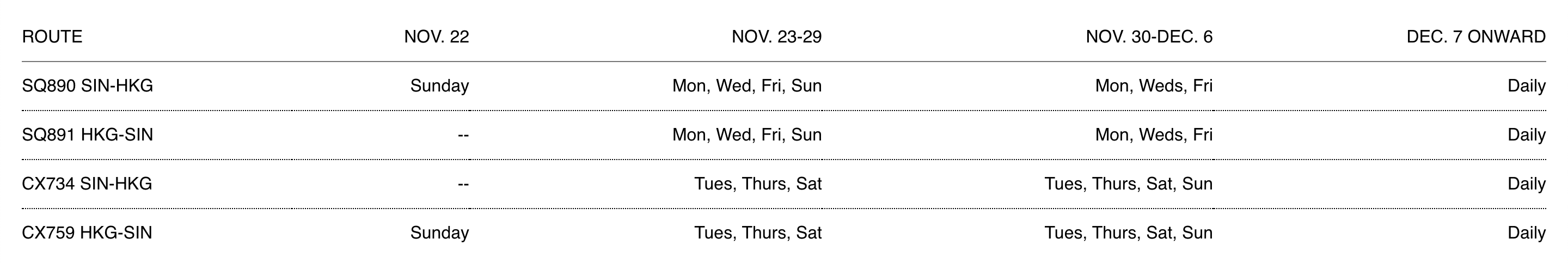 There will be flights twice a week on Singapore Airlines and Cathay Pacific on 22 November—slowly rising to daily flights from 7 December. A maximum of 200 people will be permitted on each flight.