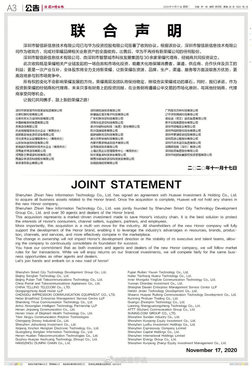 Huawei highly appreciates the continued dedication, attention, and support given by Honor’s consumers, channel sellers, suppliers, partners, and employees.