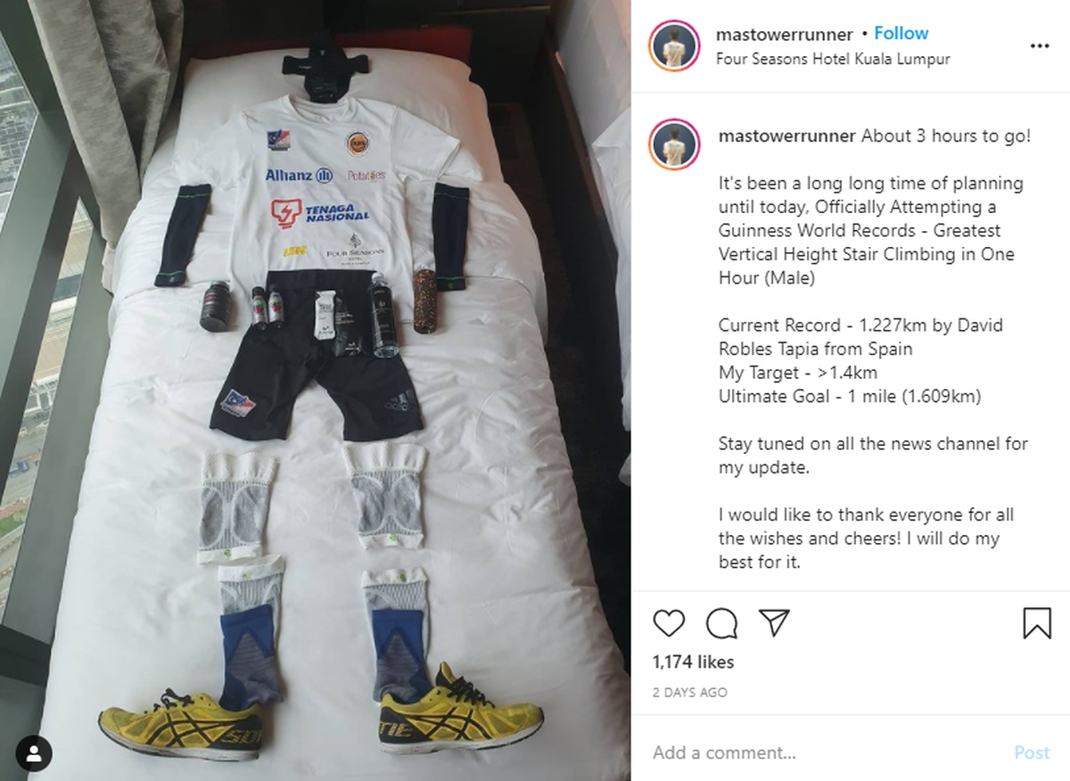 Meanwhile, the tower runner explained that one of the reasons for the attempt was to promote Malaysia on a global stage, while growing awareness and raising funds for the sport. Eventually, the aim is to have tower running included as an official event at the Olympics, Soh explained.