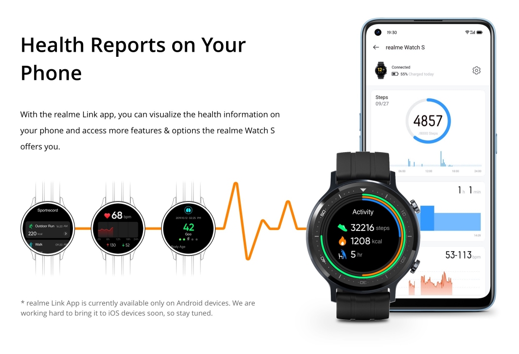 The Watch S supports fitness tracking of 16 sports mode and it also offers real-time heart rate monitoring along with blood oxygen monitoring. Apart from displaying app notifications, you can also control your music playback and your phone’s camera remotely from your wrist. To access the watch features and health information on your phone, you’ll need to install the Realme Link app which is currently only available for Android devices.