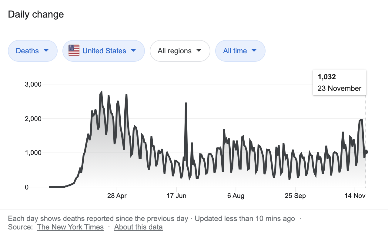 On the 23 November, the U.S. gained 178,945 COVID-19 cases in one day. The cases in the country have been skyrocketing—with about 1,000 to nearly 2,000 deaths daily. The U.S. is the country with the highest number of daily cases and deaths, above India, Brazil and France.
