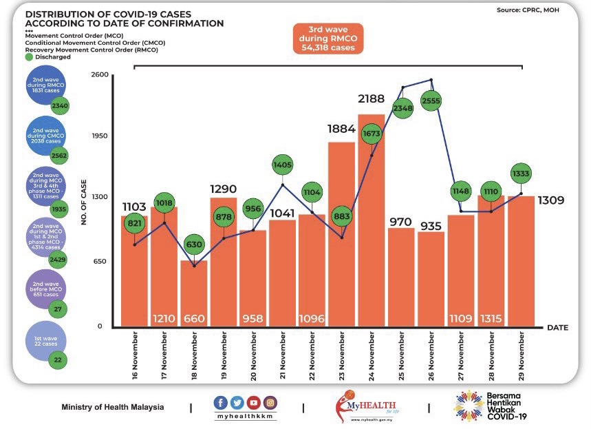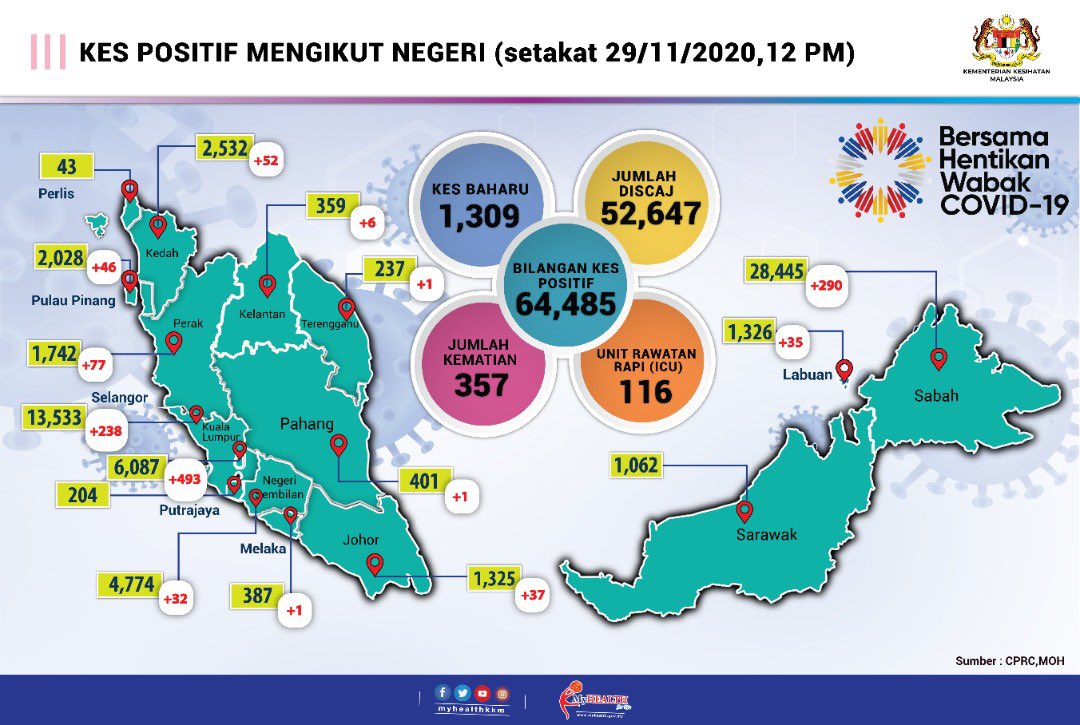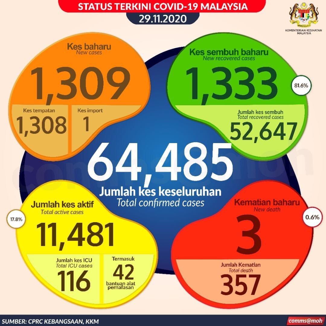 Malaysia has recorded 1,309 new COVID-19 cases today which brings the total number of infections to 64,485. There are 3 new deaths reported and the death toll is now 357.