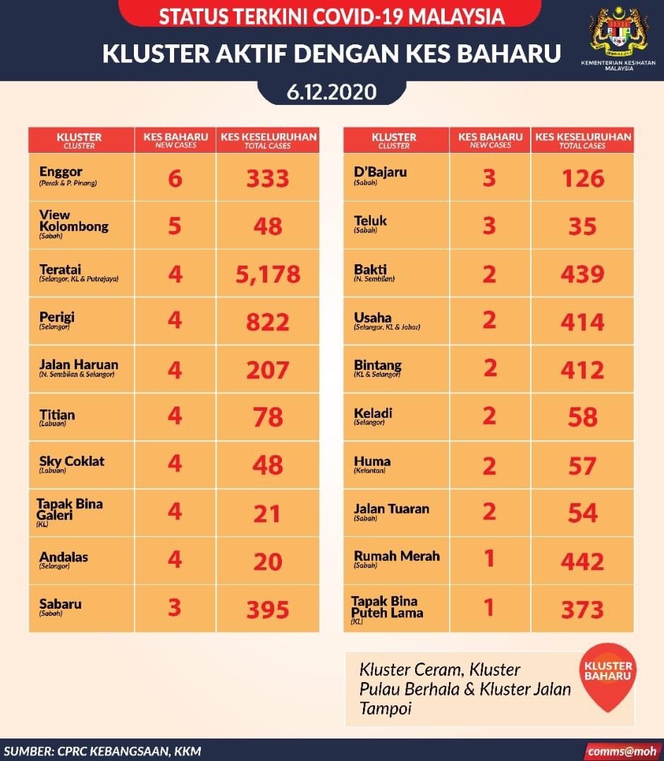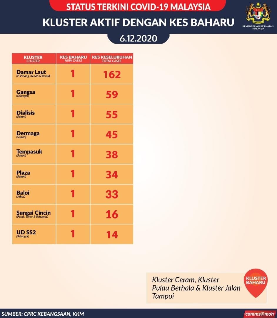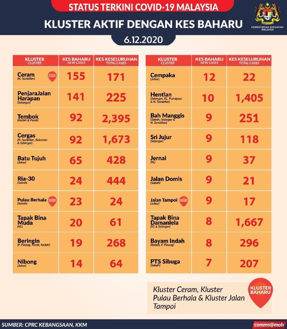 According to the Ministry of Health, 3 new clusters have been identified. This include Ceram cluster in Negeri Sembilan, Pulau Berhala cluster in Sabah and Jalan Tampoi cluster in Johor.