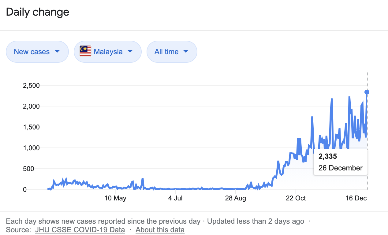 Cases in Malaysia have risen to more than 1,000 cases for a while now. The first peak started on 22 October at 1,228 cases. It rose to a whopping 2,335 cases on 26 December, with KL and Selangor recording over 700 cases each that day. Yesterday, Malaysia had a total of 1,196 cases—with Selangor recording 392 cases, and Kuala Lumpur with 202 cases.