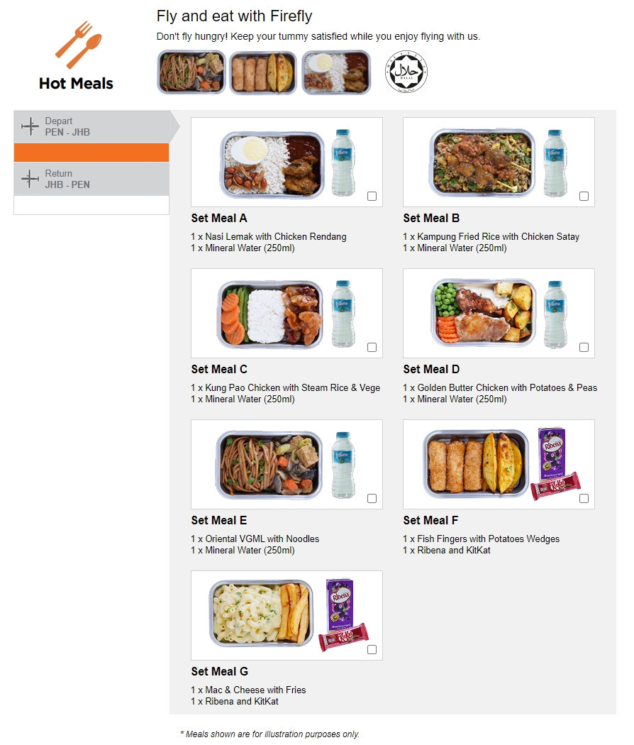 If you choose the FlyBasic option, you can still purchase hot meals for RM12.00 per set. The meals are included with the FlyPremier and FlyInfinite option.