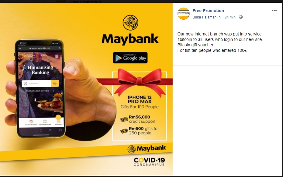 The Facebook ad mentions that they are giving away an iPhone 12 Pro Max for the first 1,000 people and all you need to do is to “log in” to your account and confirm the SMS. What’s disturbing is the ad may show the URL “Maybank2u.com.my” despite being directed to a different page.