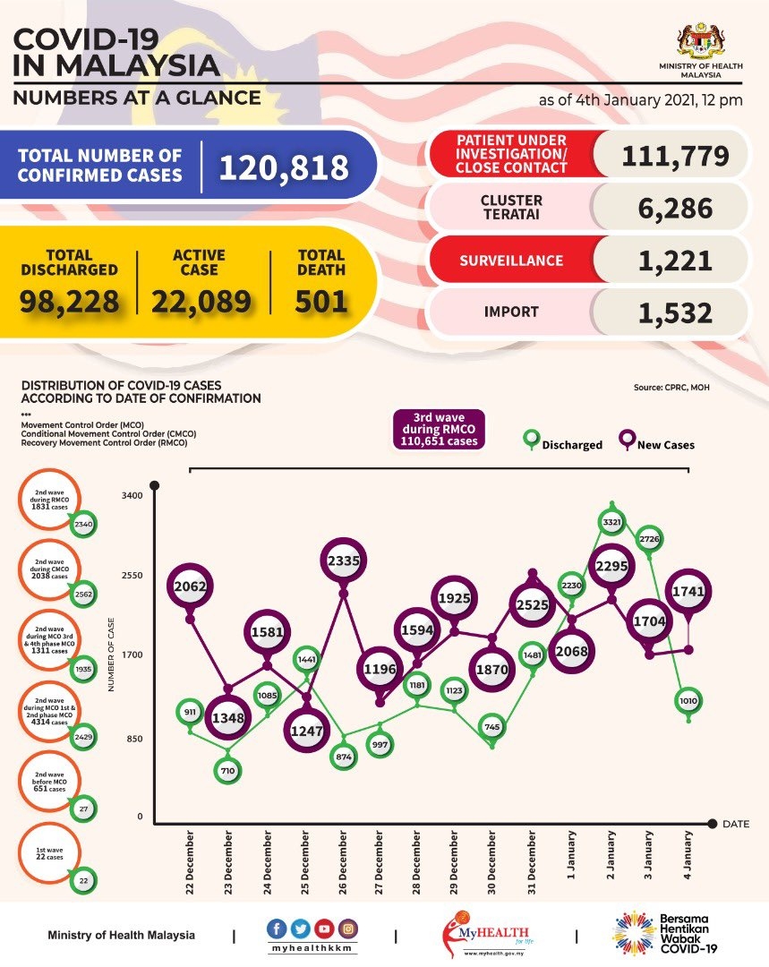 Malaysia has recorded 1,741 new COVID-19 cases today which brings the total number of infections to 120,818. There are 7 new deaths reported and the death toll is now 501.