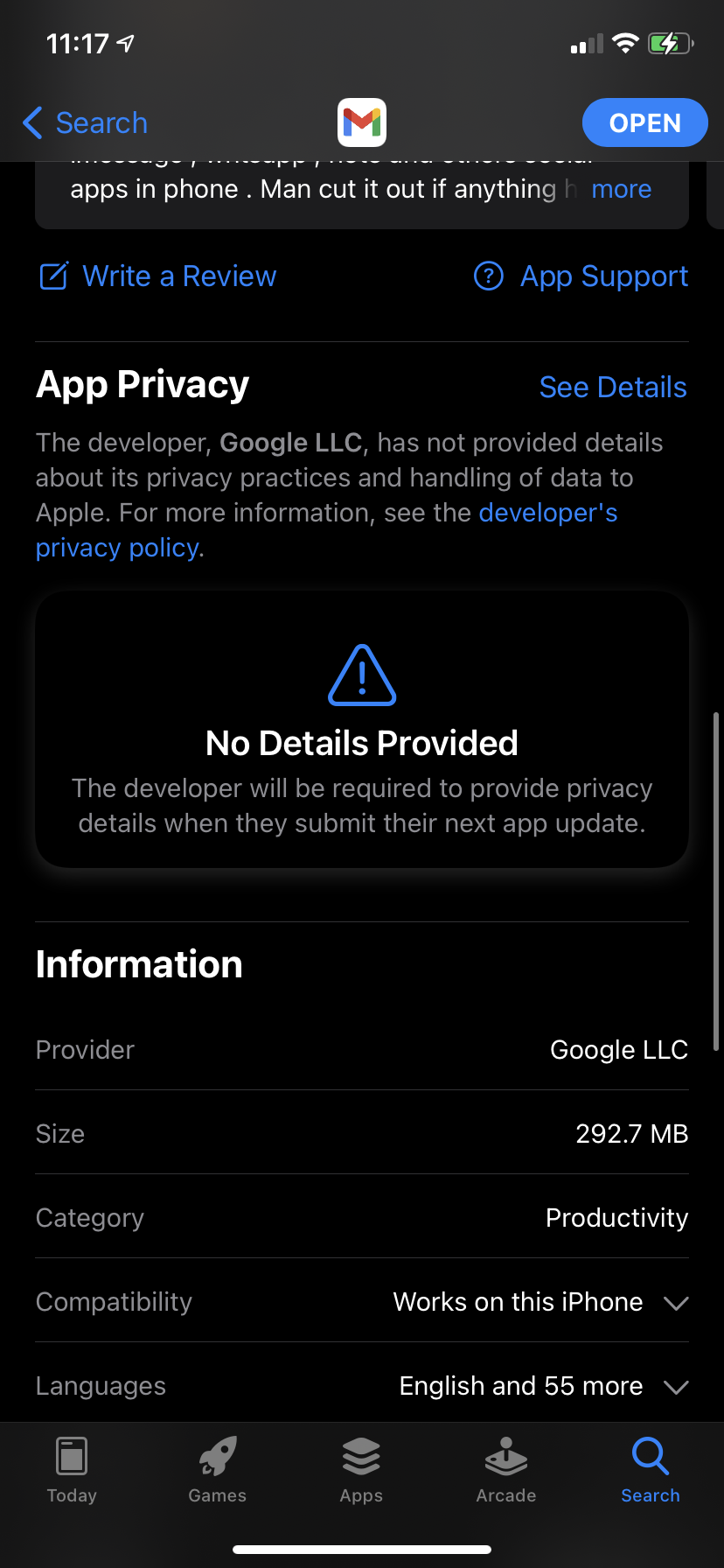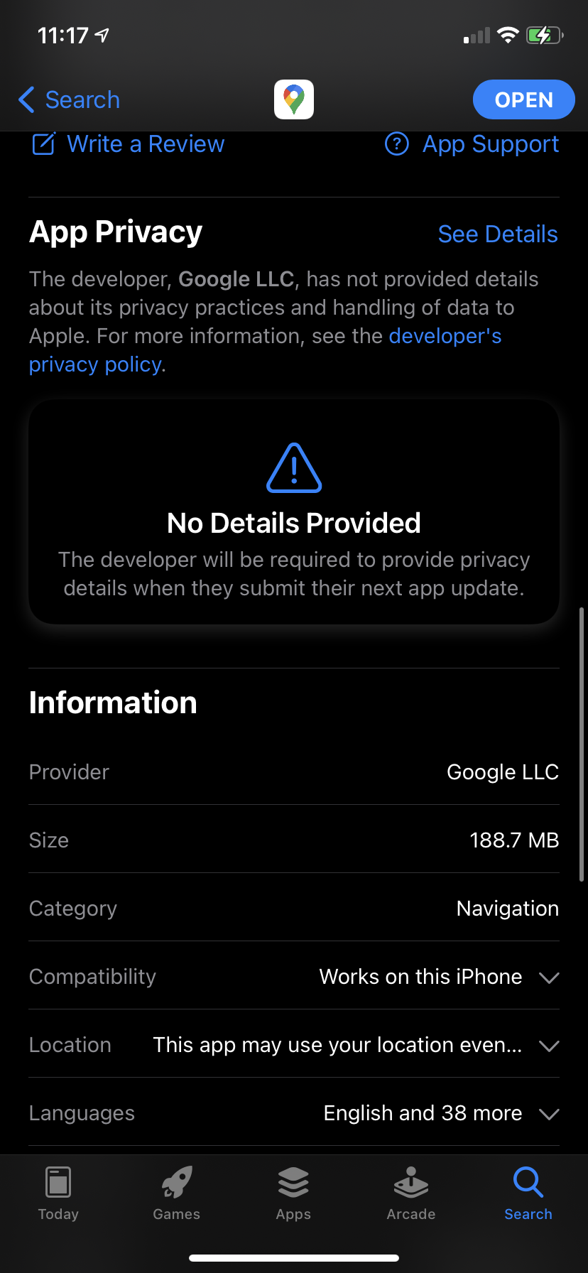 So far, it looks like the privacy details for Google’s apps have not yet been updated. This includes the YouTube app, Google Maps, and the Gmail app.